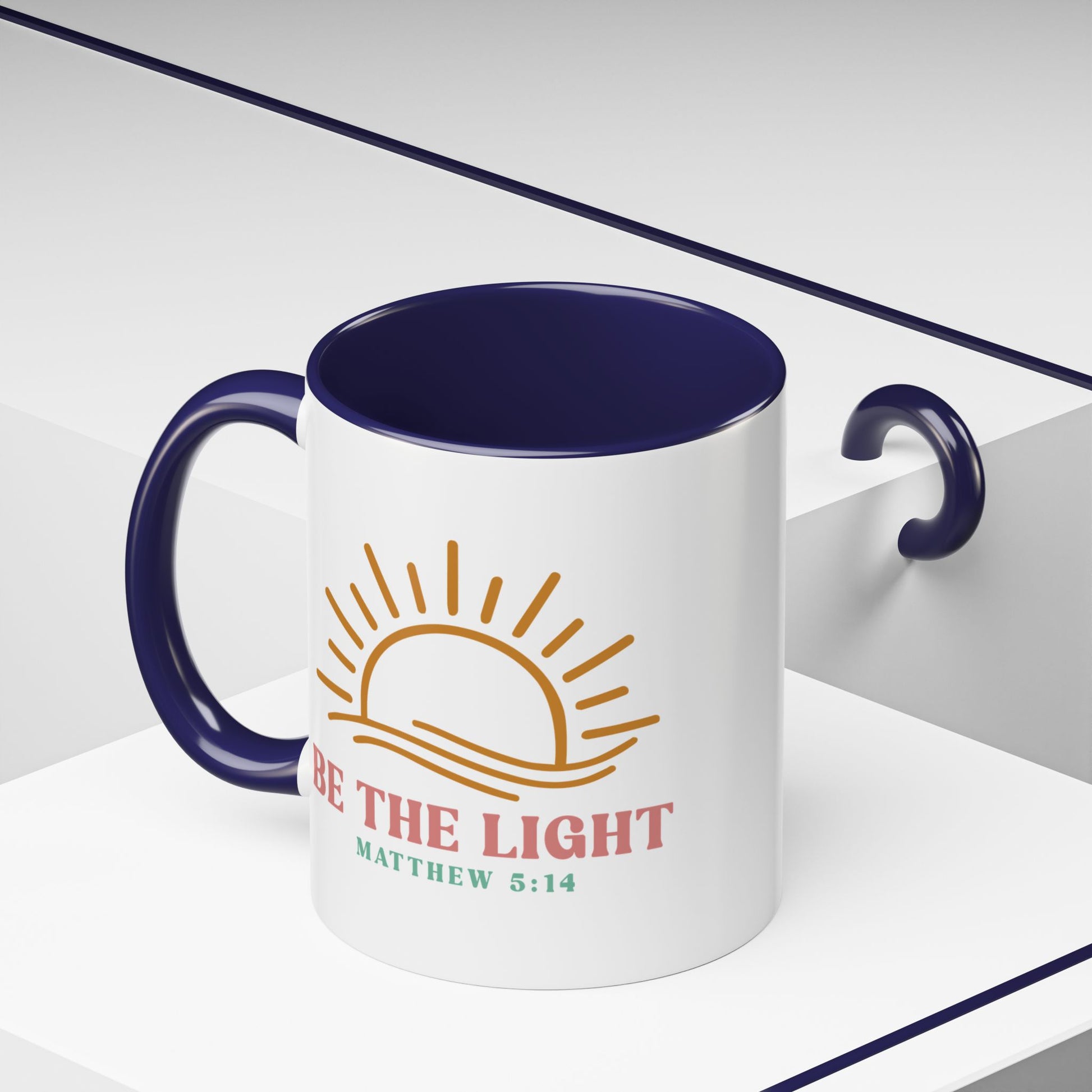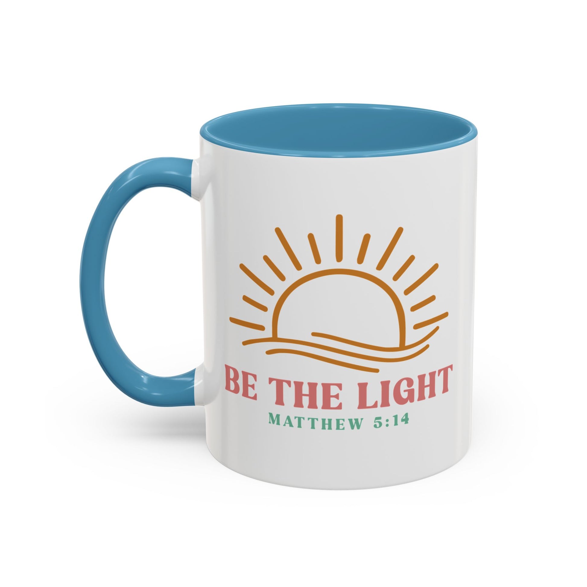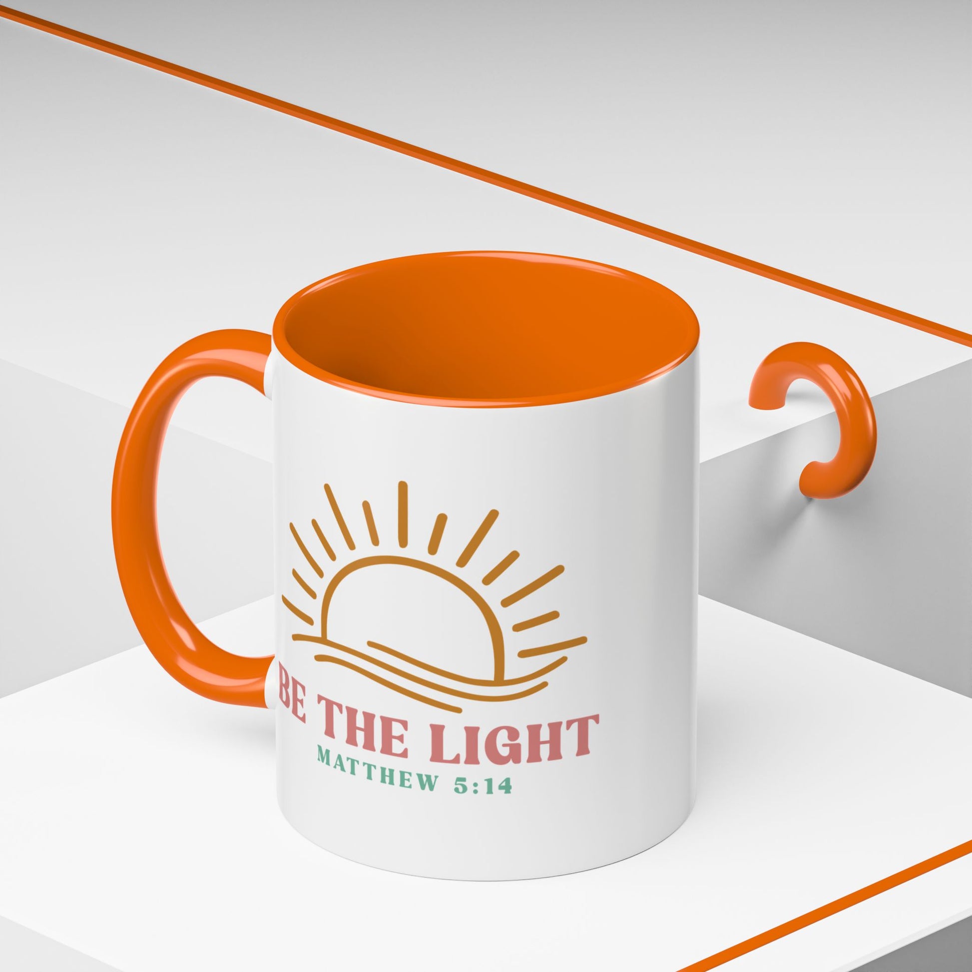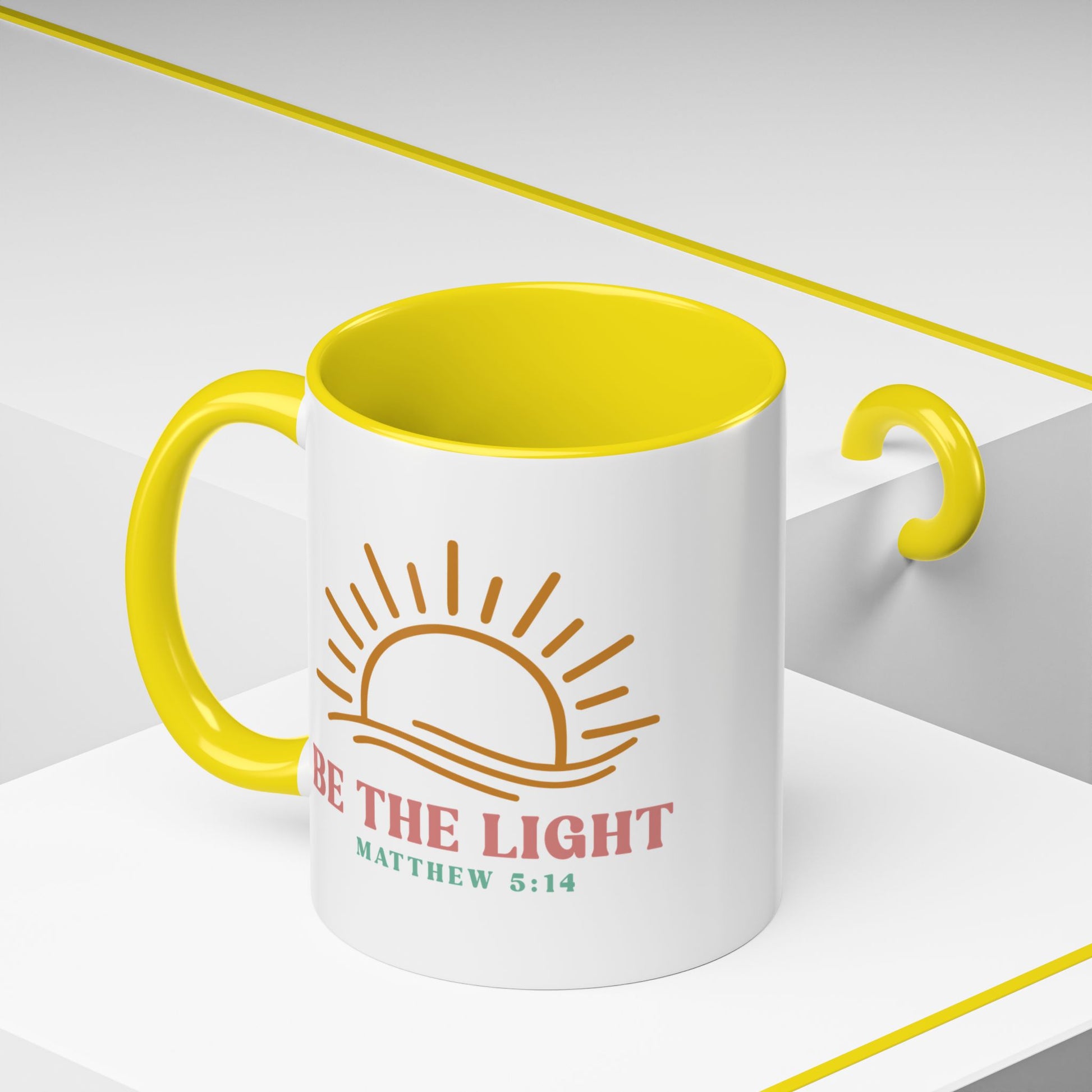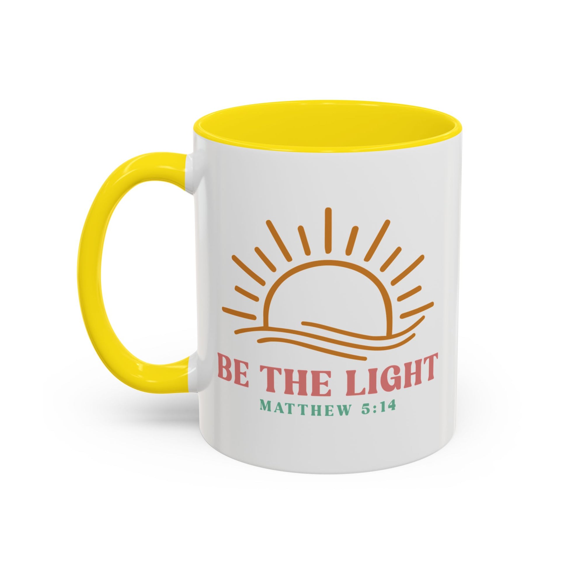 "Be The Light" Matthew 5:14 Accent Coffee Mug is the perfect way to start your day with positivity and motivation. This motivational drinkware is a great gift for friends and a beautiful addition to your home decor. The vibrant colors and glossy finish make it eye-catching and perfect for those who want a reminder to shine bright every day. Ideal for those who enjoy a warm cup of coffee or tea, and perfect for religious, spiritual, or inspirational occasions and celebrations.
