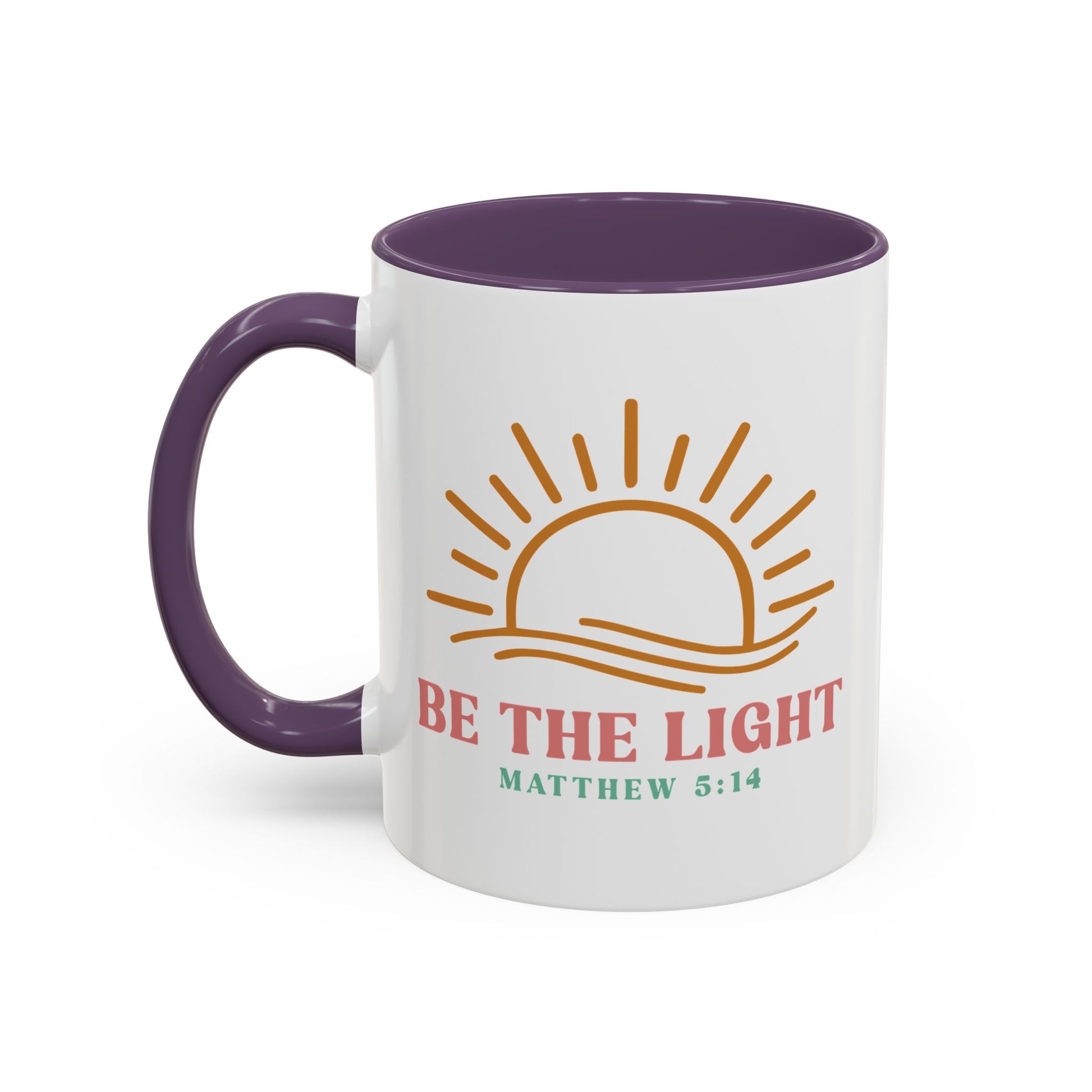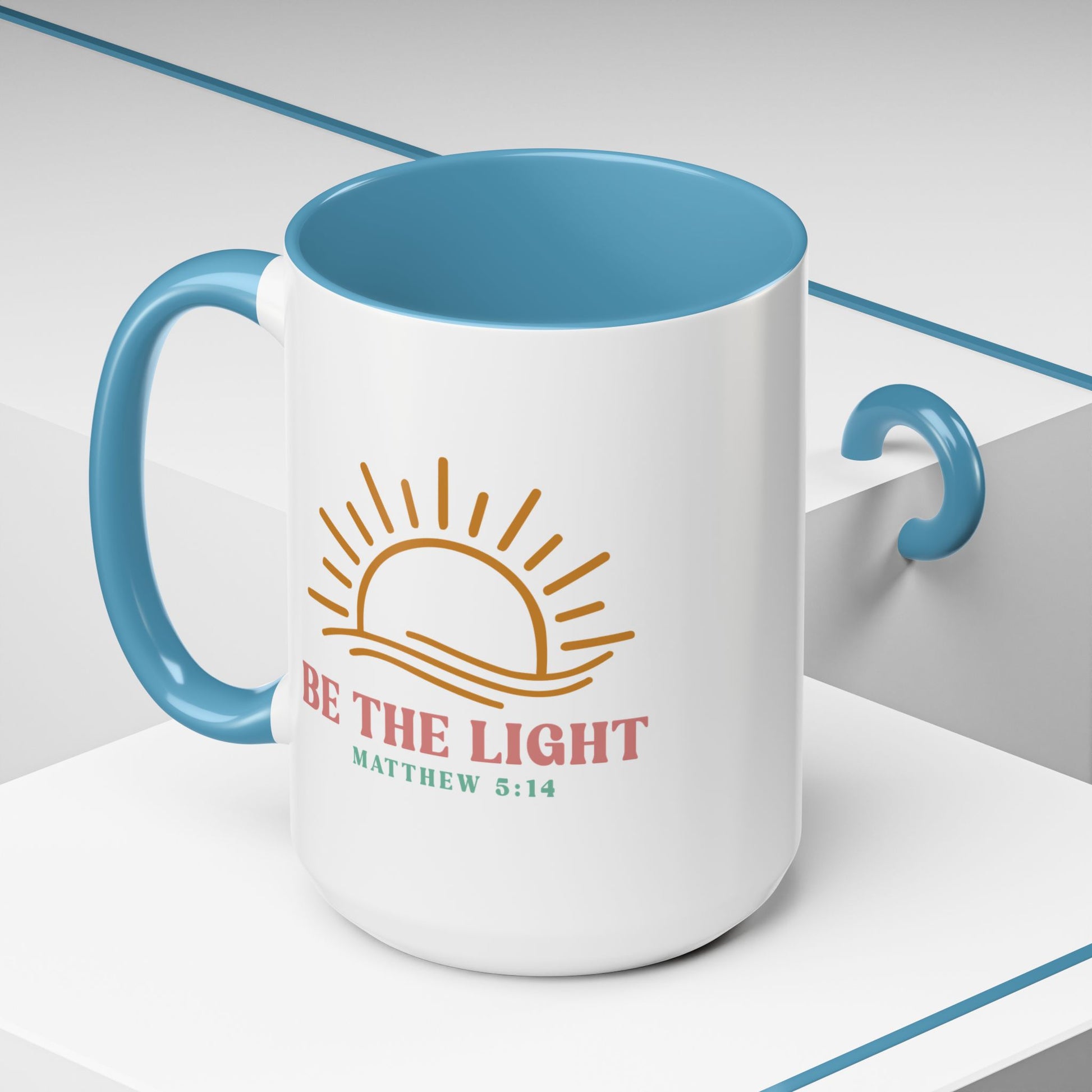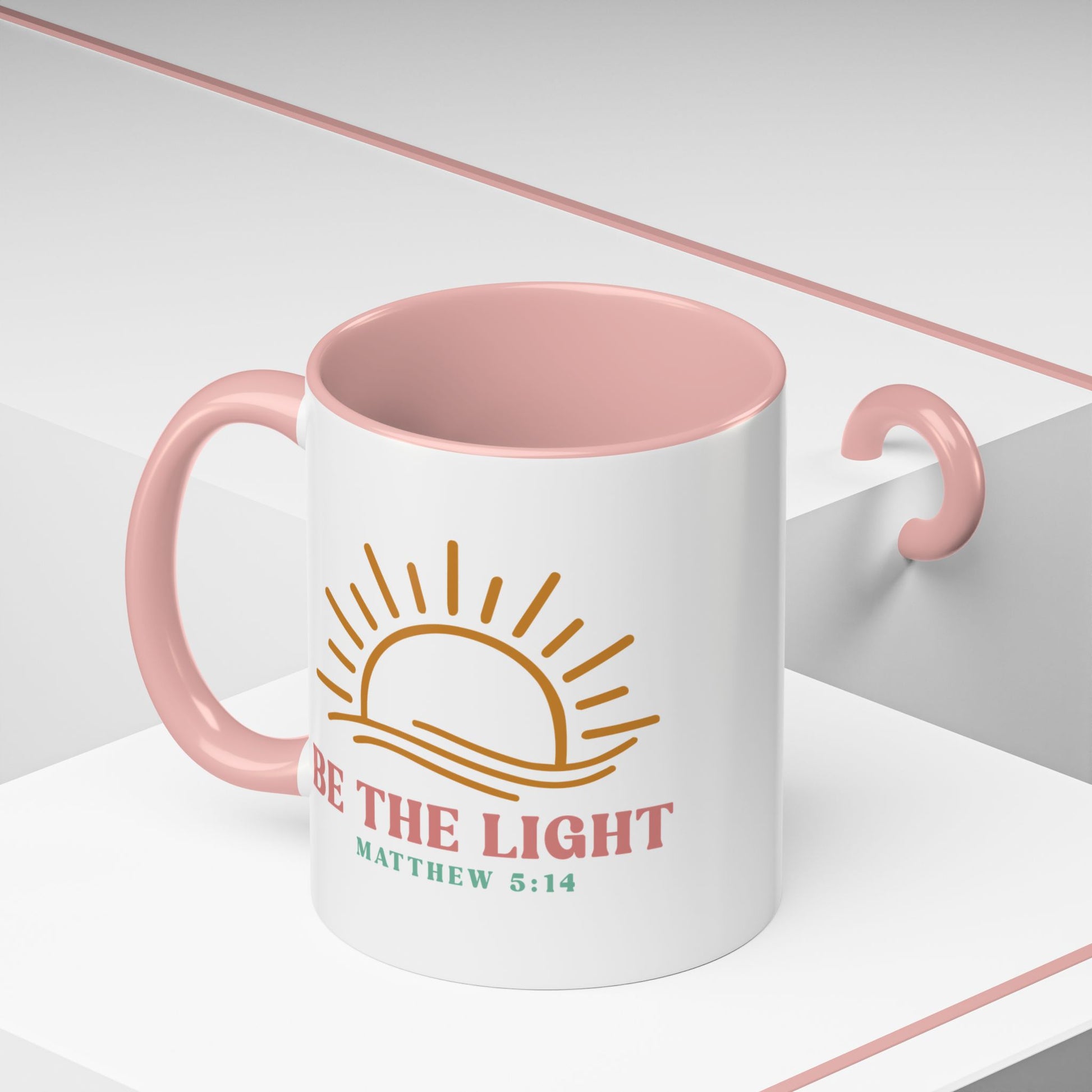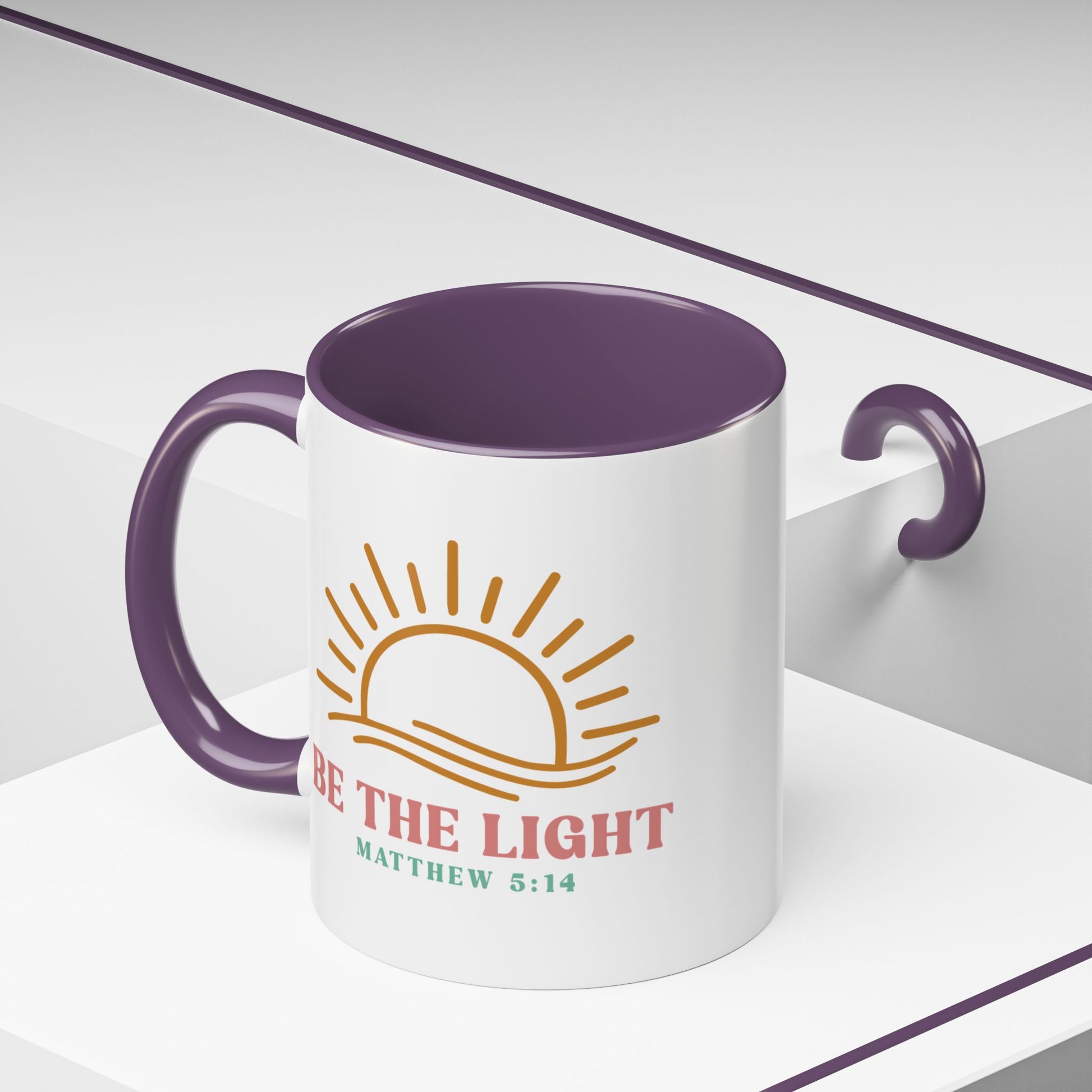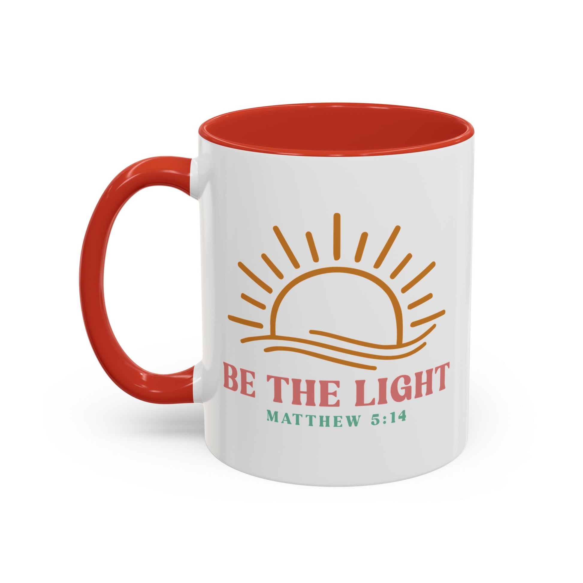 "Be The Light" Matthew 5:14 Accent Coffee Mug is the perfect way to start your day with positivity and motivation. This motivational drinkware is a great gift for friends and a beautiful addition to your home decor. The vibrant colors and glossy finish make it eye-catching and perfect for those who want a reminder to shine bright every day. Ideal for those who enjoy a warm cup of coffee or tea, and perfect for religious, spiritual, or inspirational occasions and celebrations.