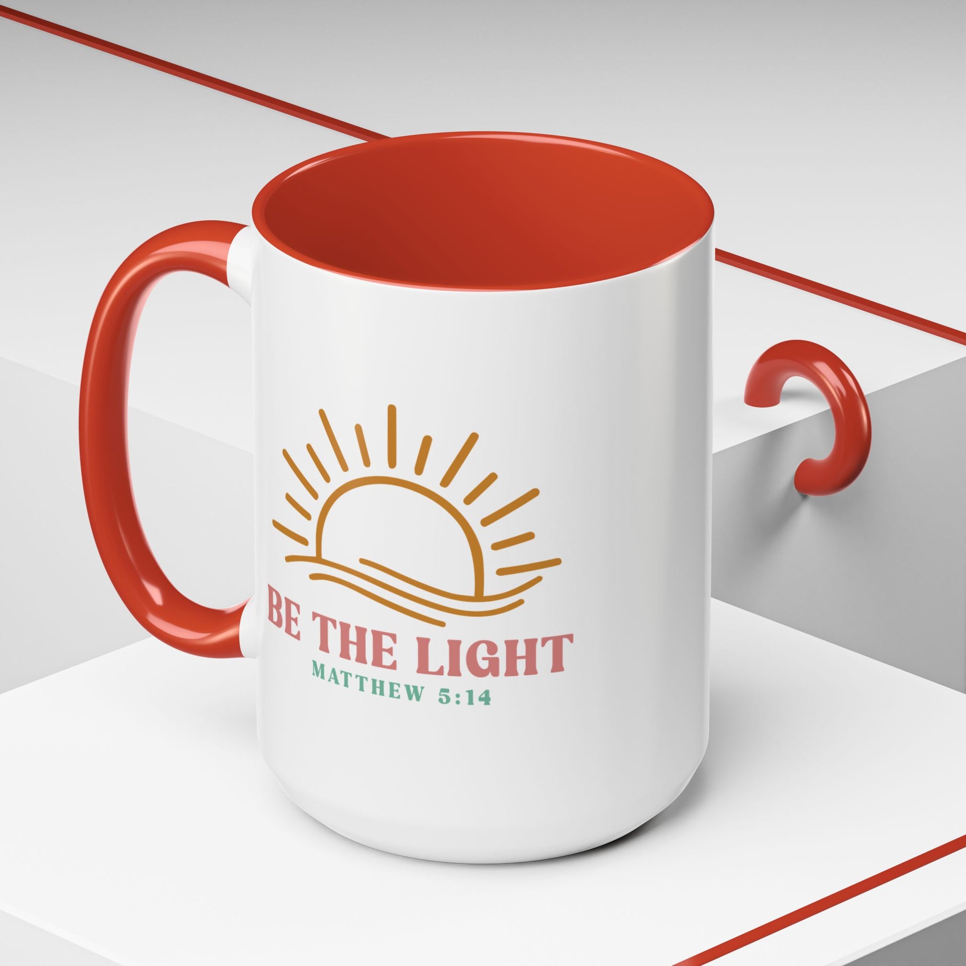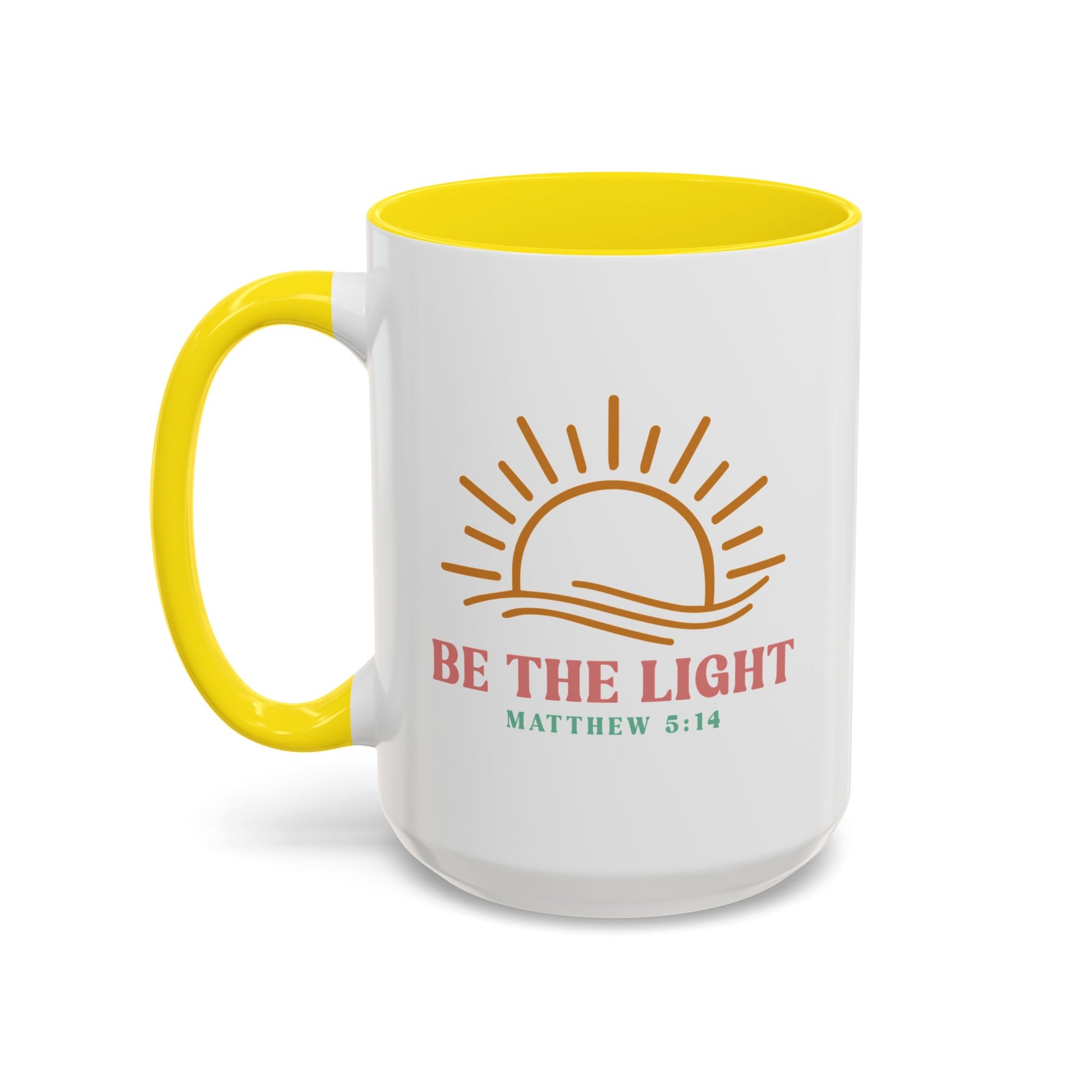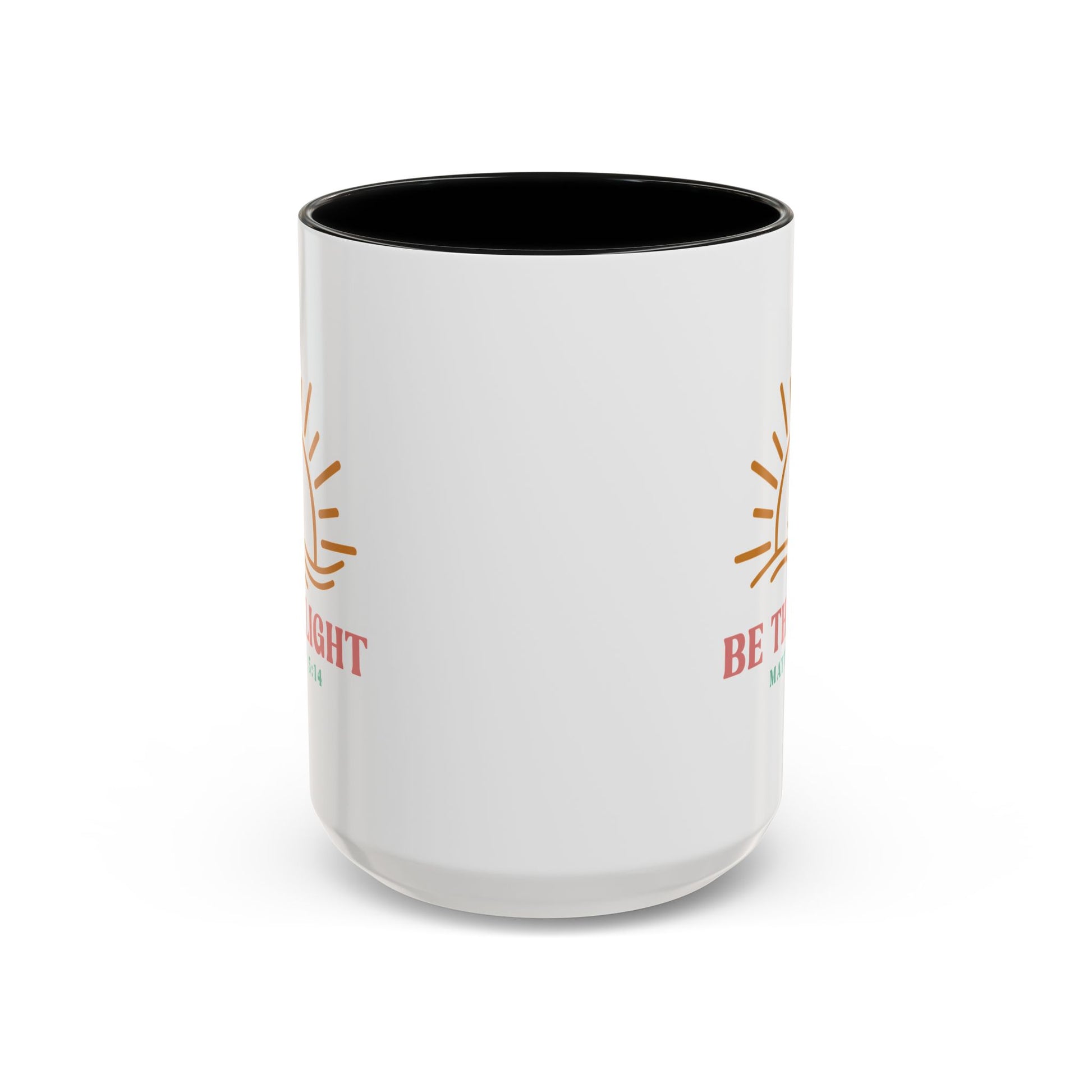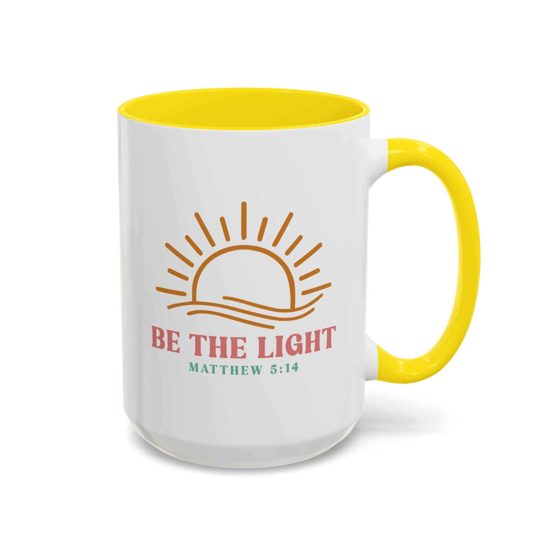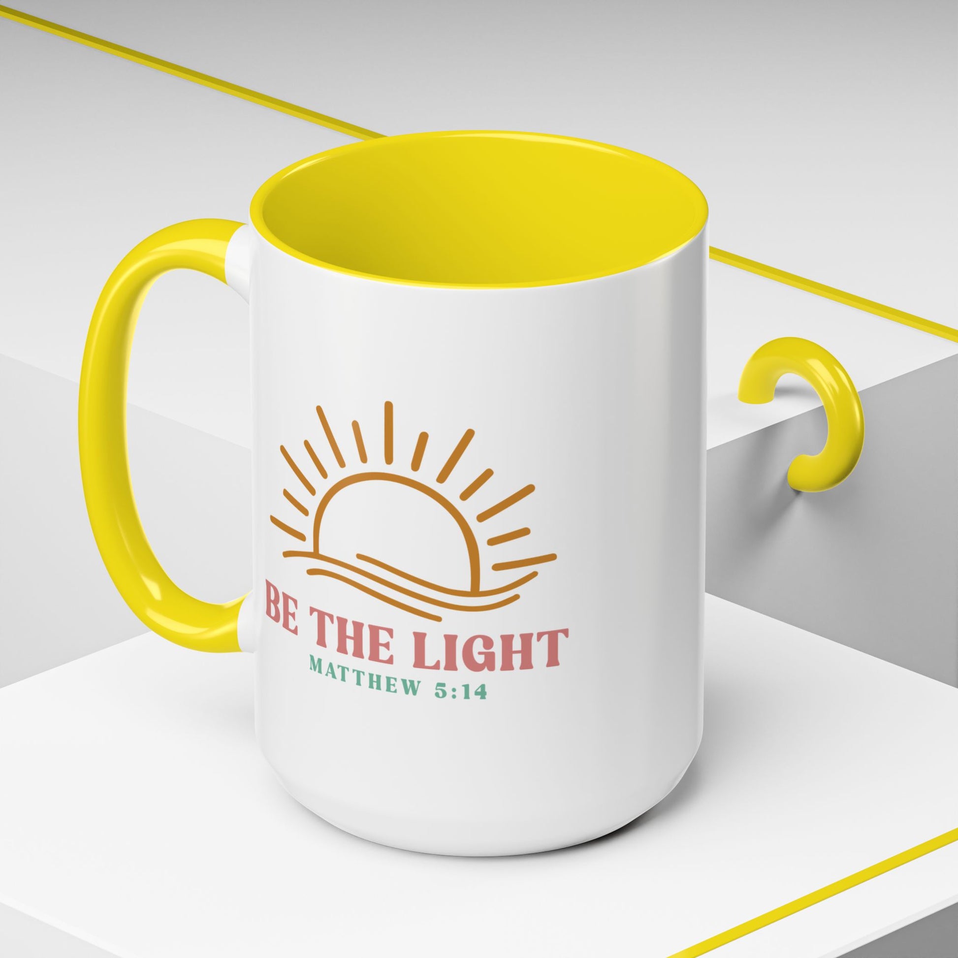 "Be The Light" Matthew 5:14 Accent Coffee Mug is the perfect way to start your day with positivity and motivation. This motivational drinkware is a great gift for friends and a beautiful addition to your home decor. The vibrant colors and glossy finish make it eye-catching and perfect for those who want a reminder to shine bright every day. Ideal for those who enjoy a warm cup of coffee or tea, and perfect for religious, spiritual, or inspirational occasions and celebrations.