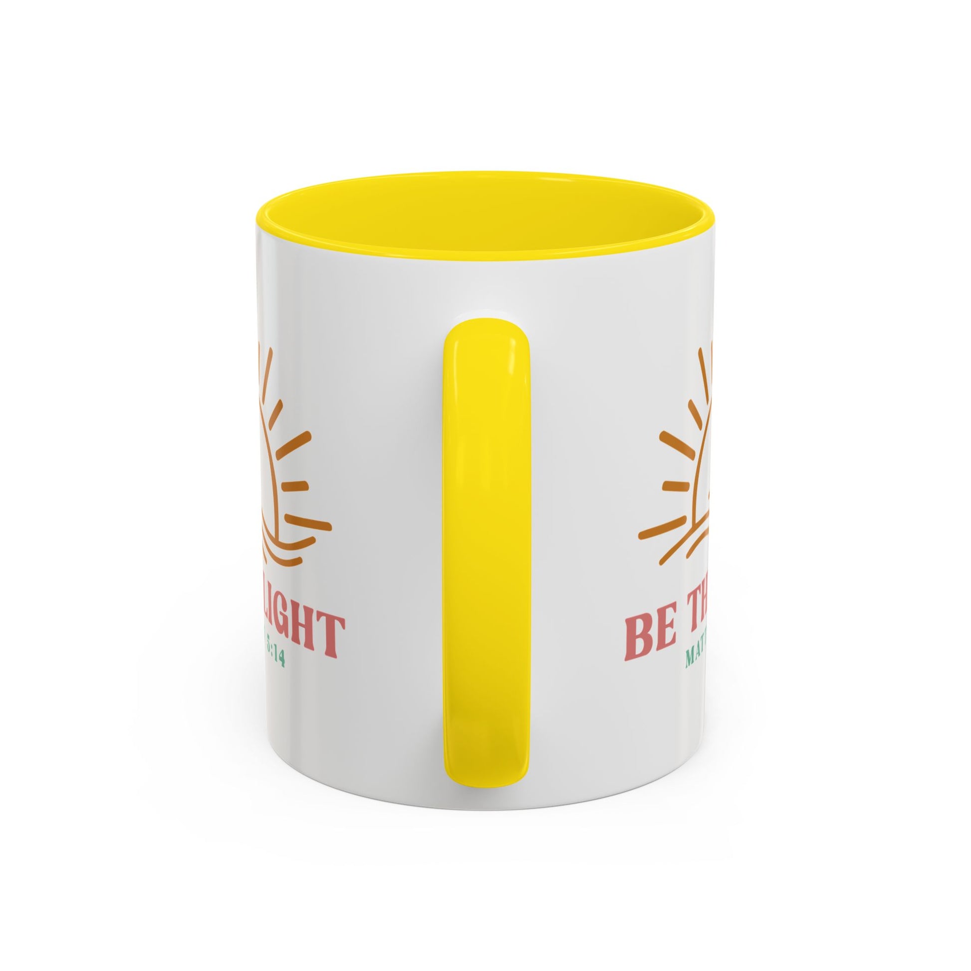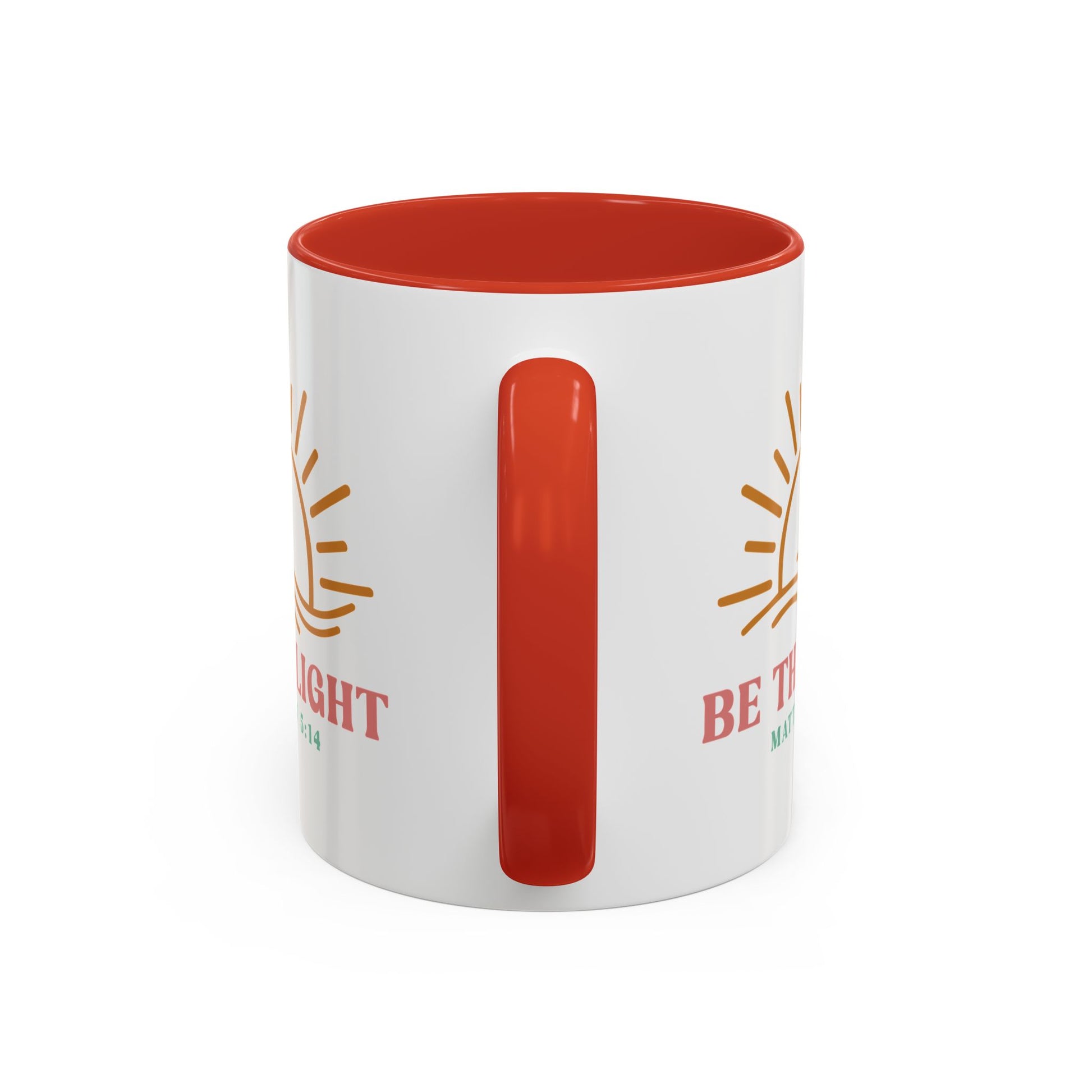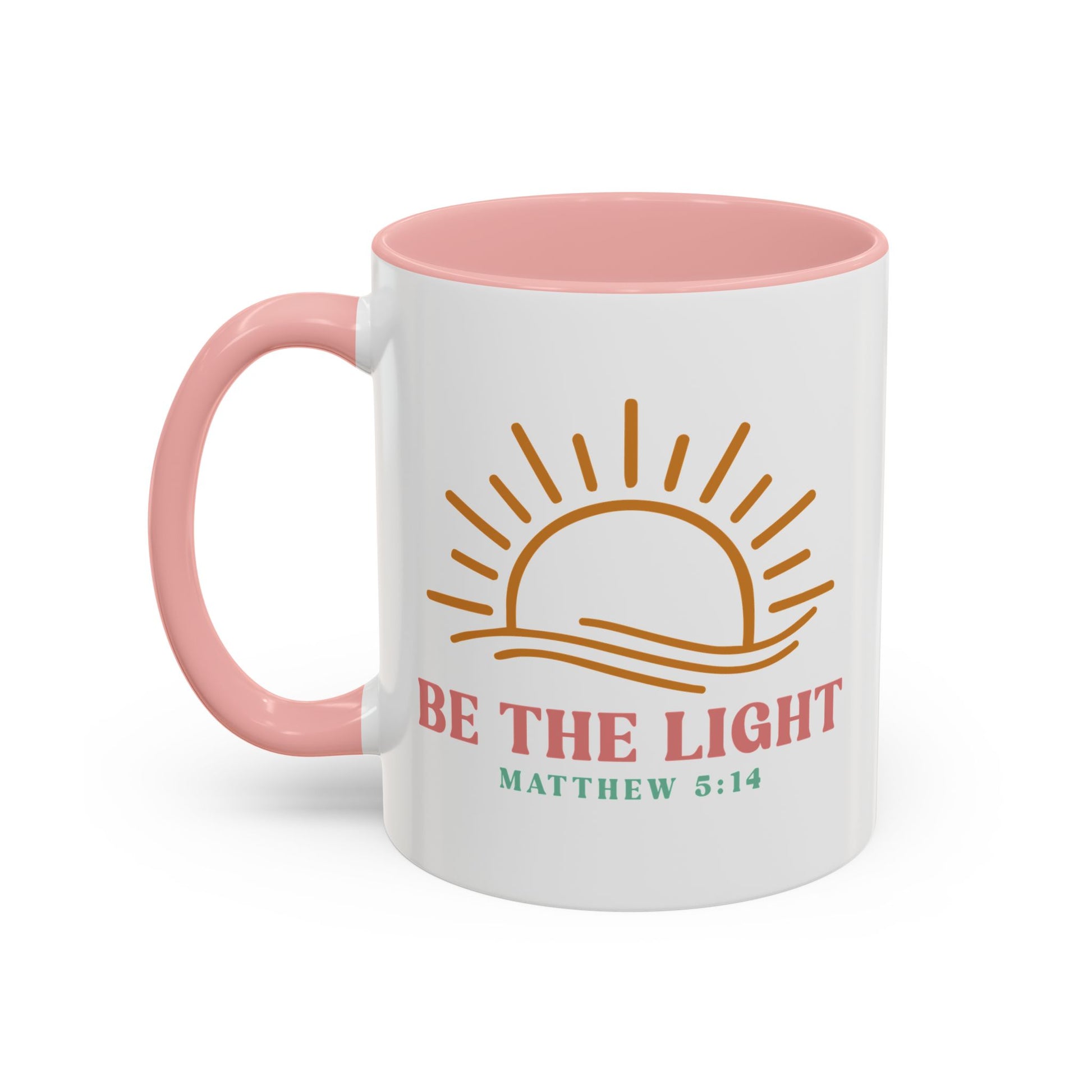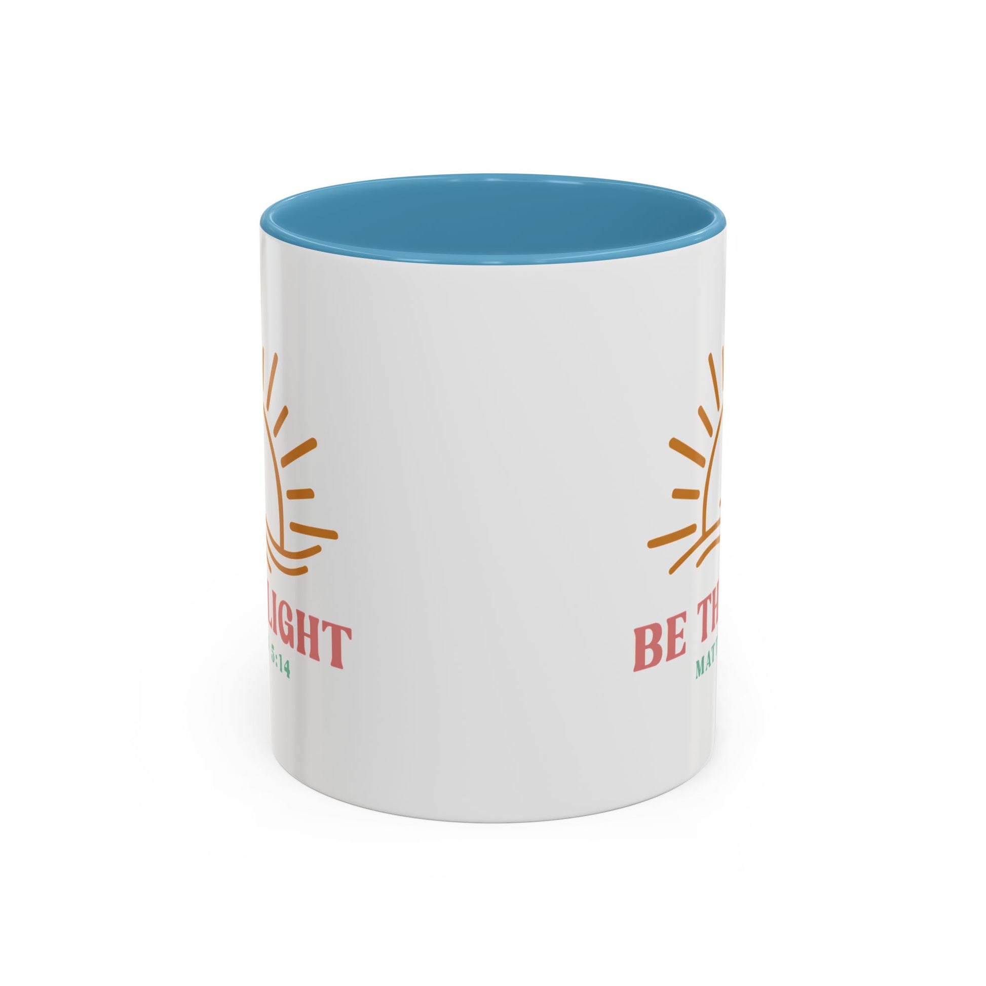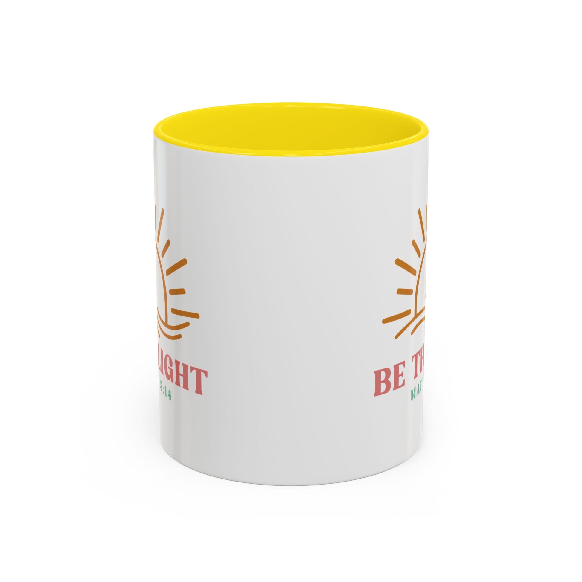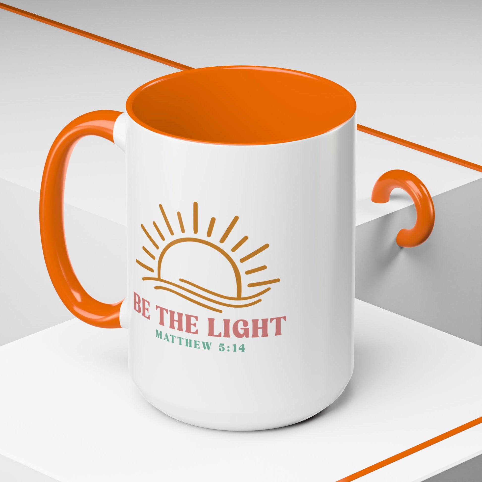 "Be The Light" Matthew 5:14 Accent Coffee Mug is the perfect way to start your day with positivity and motivation. This motivational drinkware is a great gift for friends and a beautiful addition to your home decor. The vibrant colors and glossy finish make it eye-catching and perfect for those who want a reminder to shine bright every day. Ideal for those who enjoy a warm cup of coffee or tea, and perfect for religious, spiritual, or inspirational occasions and celebrations.