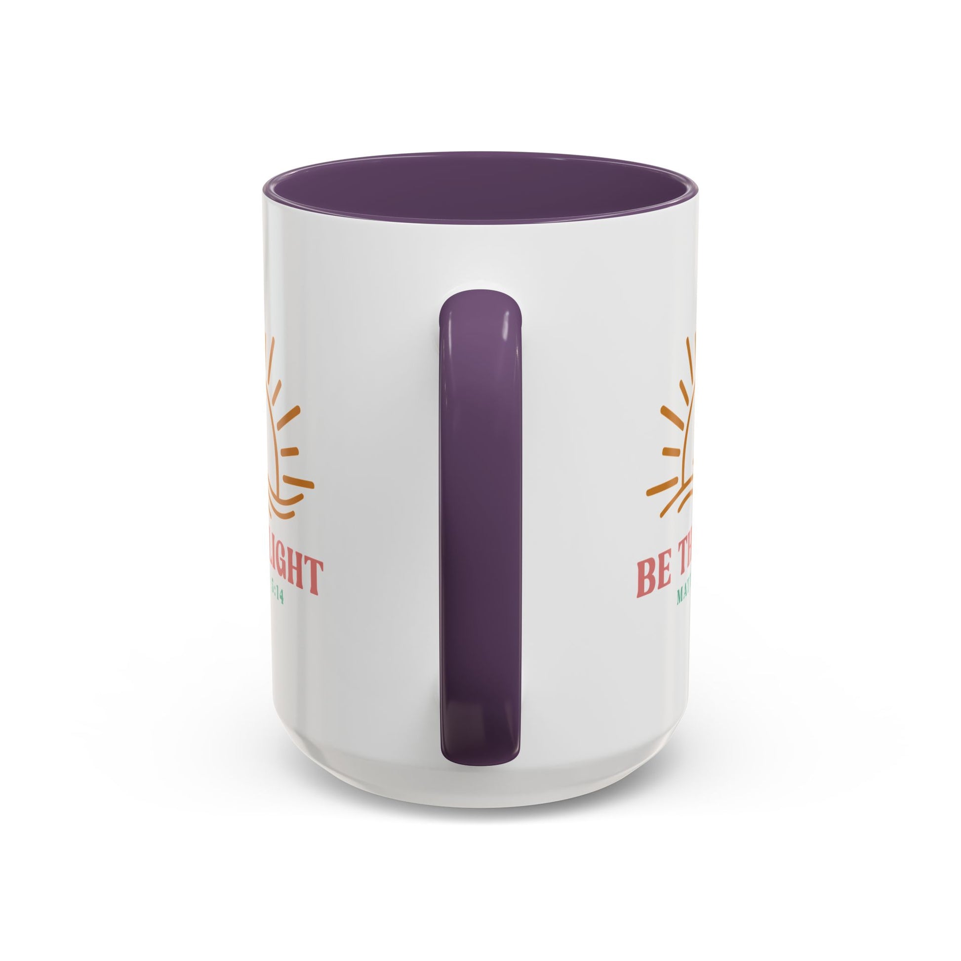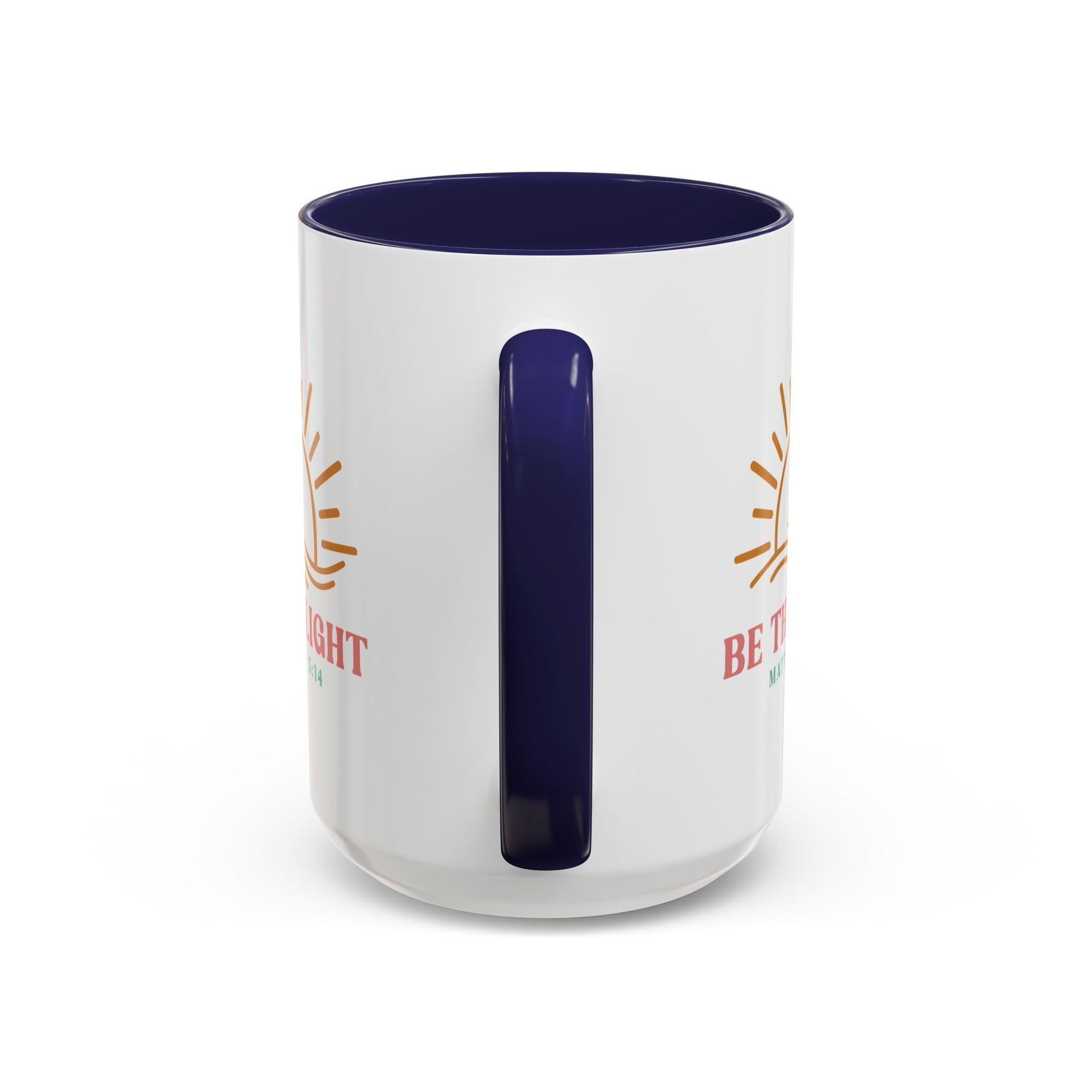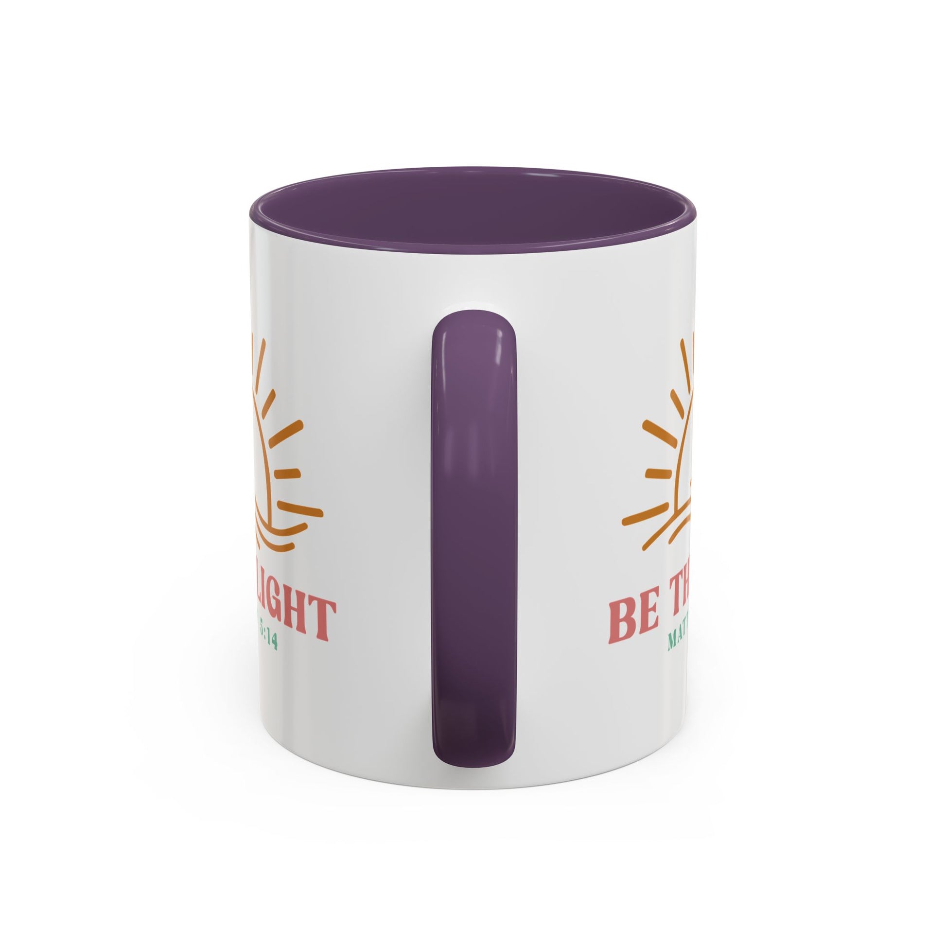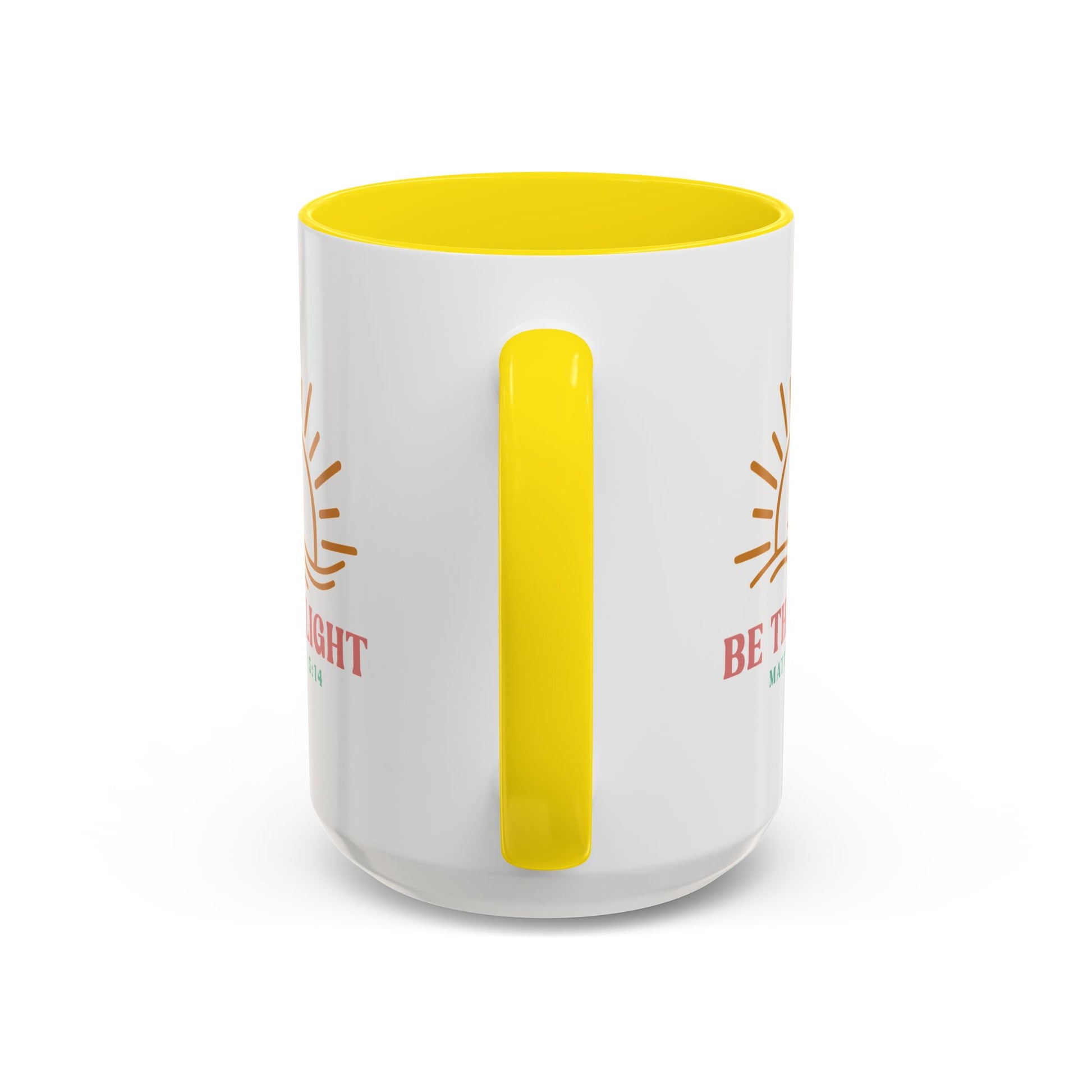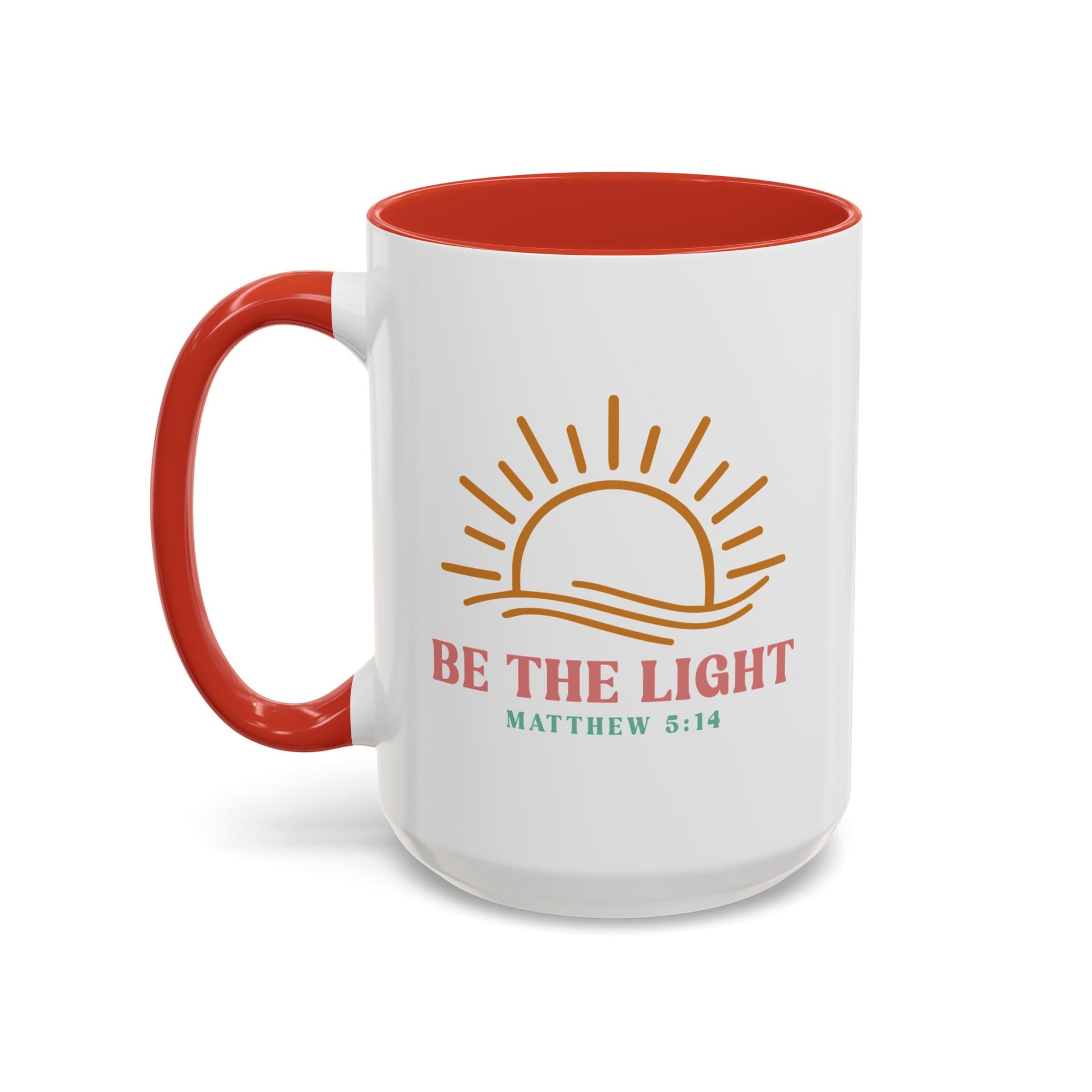 "Be The Light" Matthew 5:14 Accent Coffee Mug is the perfect way to start your day with positivity and motivation. This motivational drinkware is a great gift for friends and a beautiful addition to your home decor. The vibrant colors and glossy finish make it eye-catching and perfect for those who want a reminder to shine bright every day. Ideal for those who enjoy a warm cup of coffee or tea, and perfect for religious, spiritual, or inspirational occasions and celebrations.