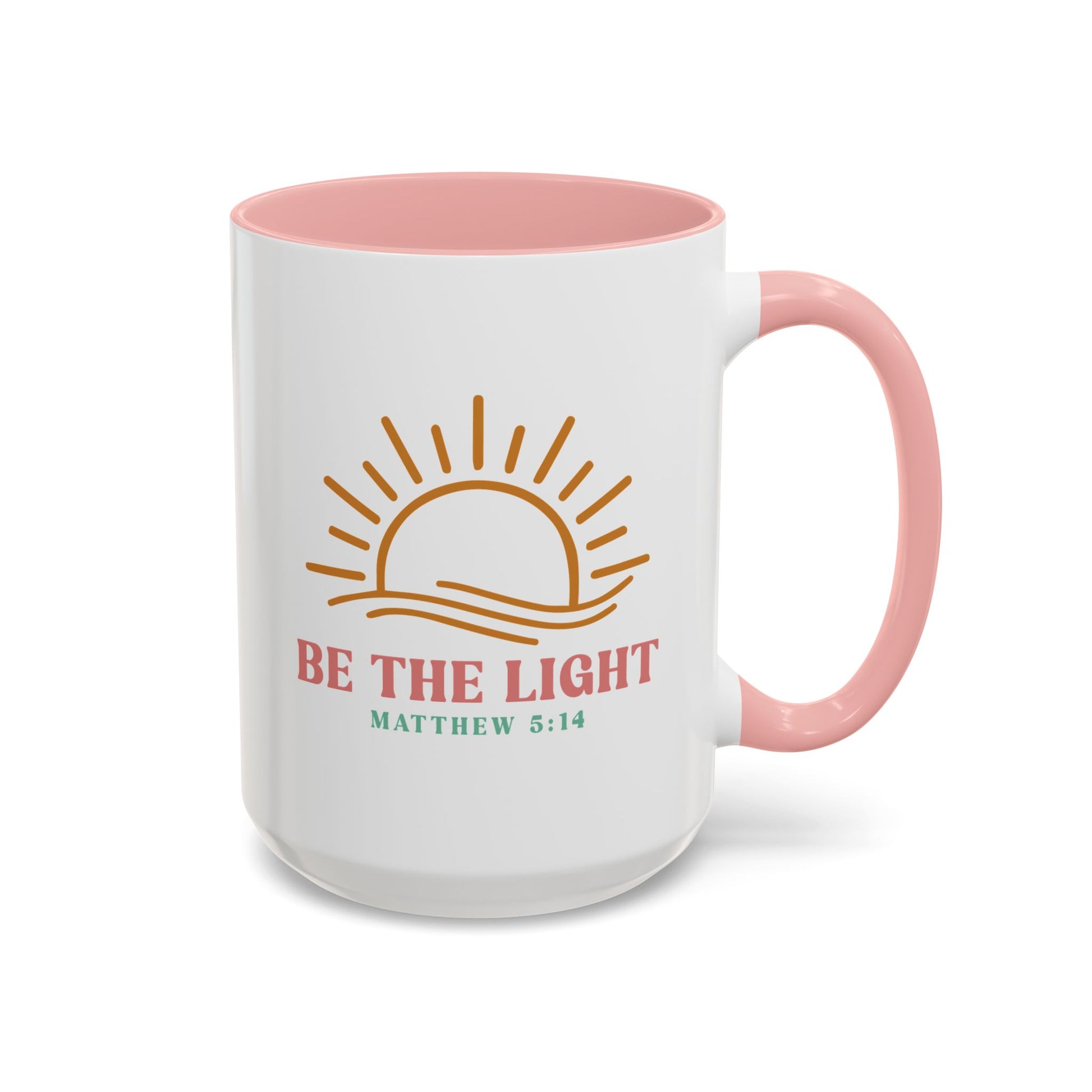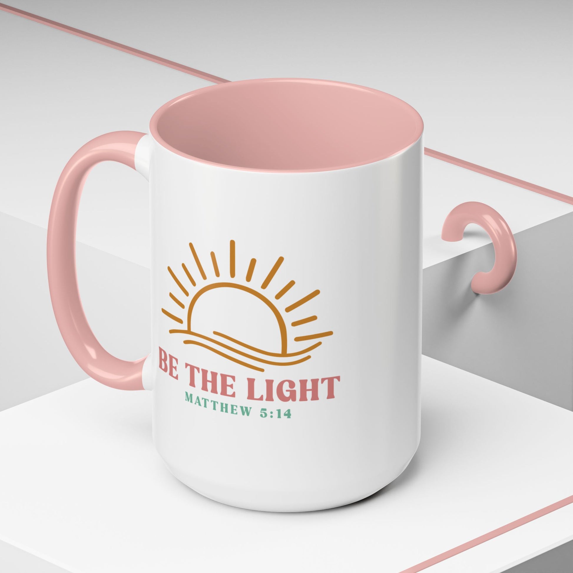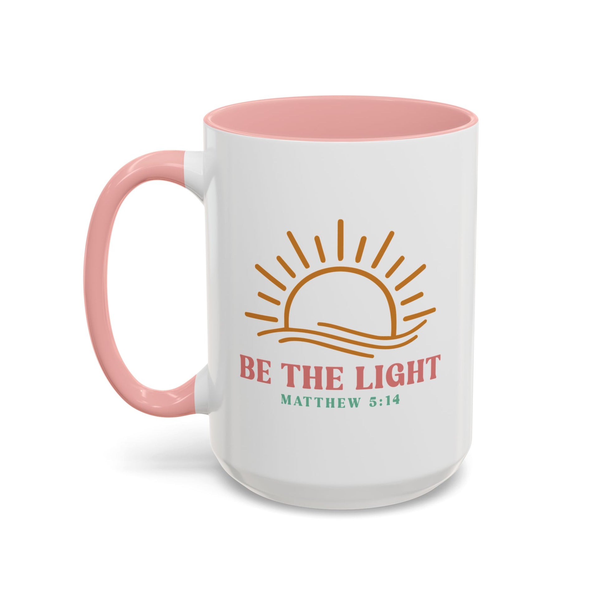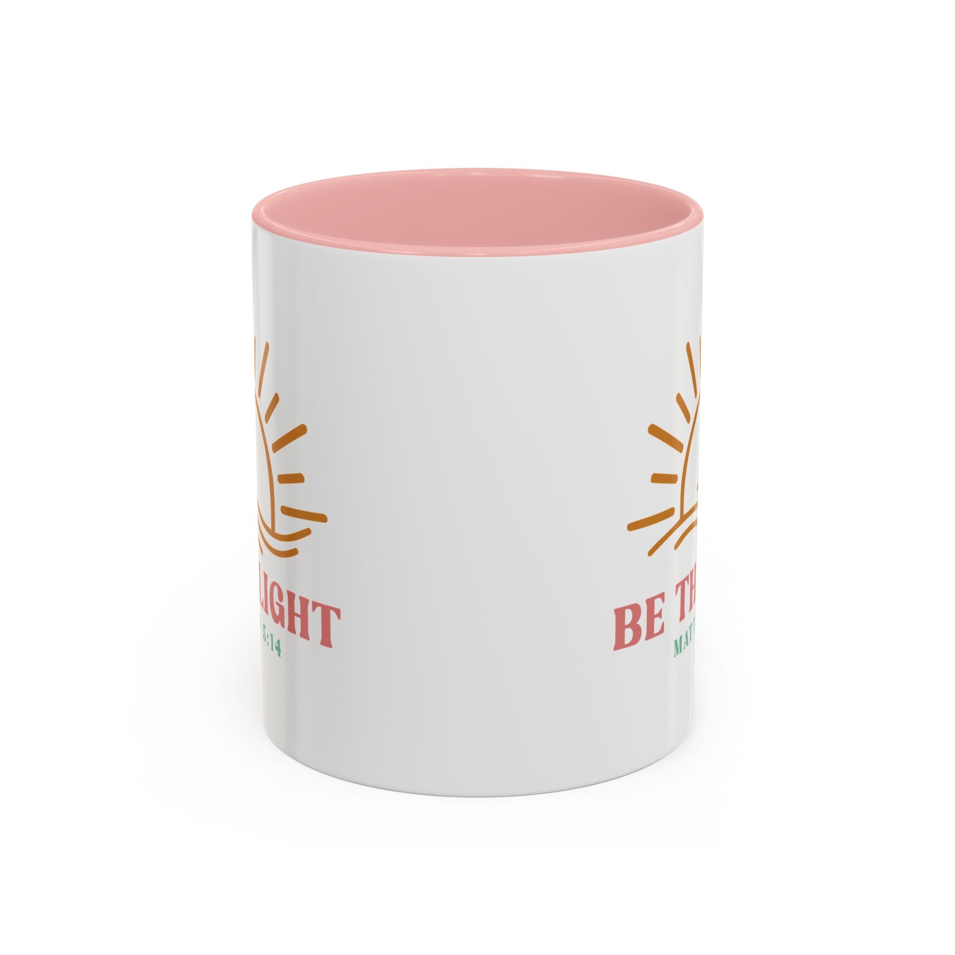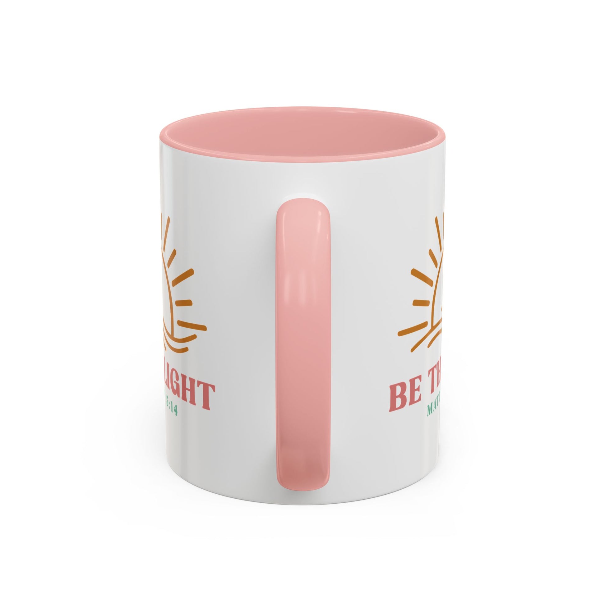 "Be The Light" Matthew 5:14 Accent Coffee Mug is the perfect way to start your day with positivity and motivation. This motivational drinkware is a great gift for friends and a beautiful addition to your home decor. The vibrant colors and glossy finish make it eye-catching and perfect for those who want a reminder to shine bright every day. Ideal for those who enjoy a warm cup of coffee or tea, and perfect for religious, spiritual, or inspirational occasions and celebrations.