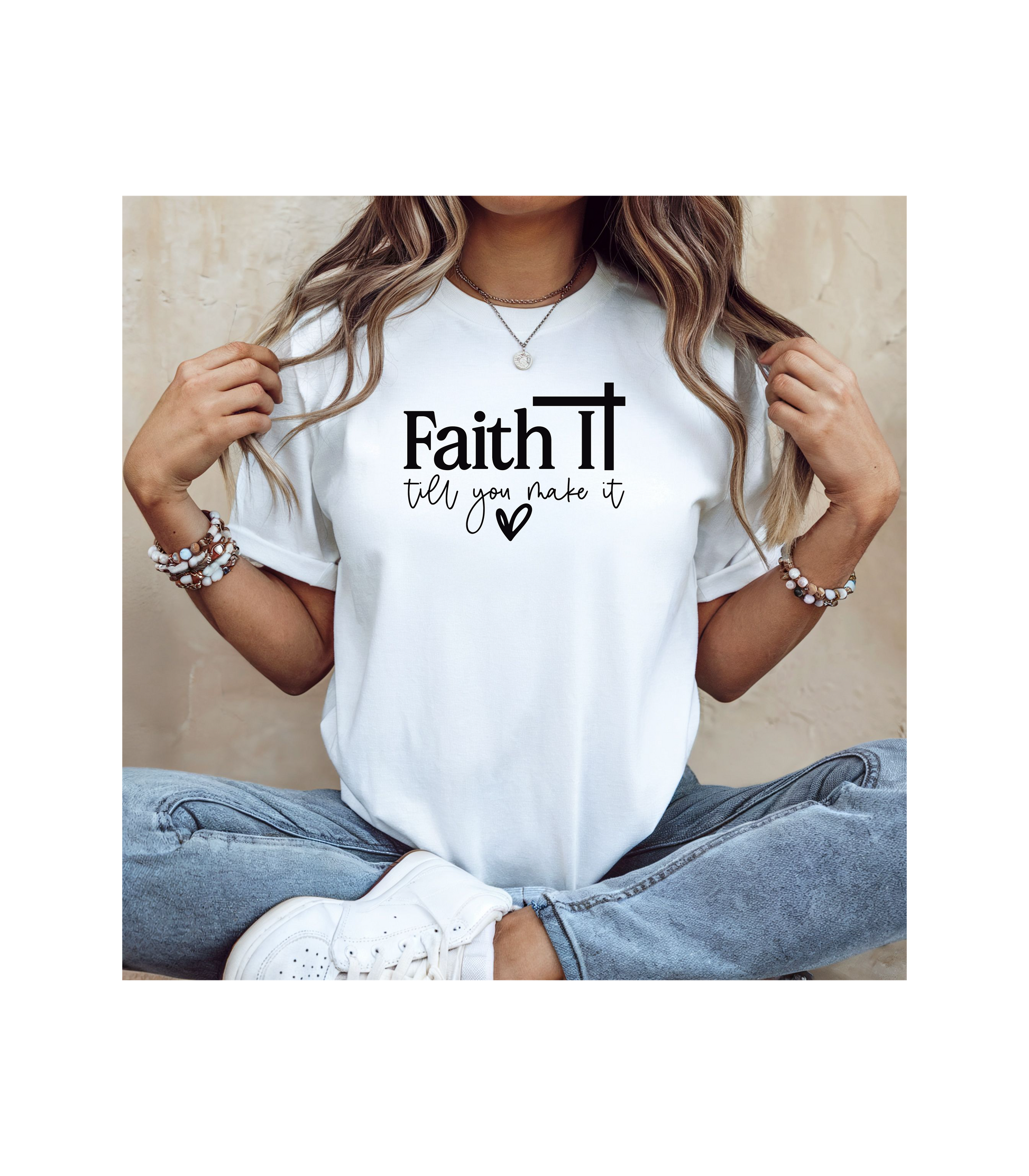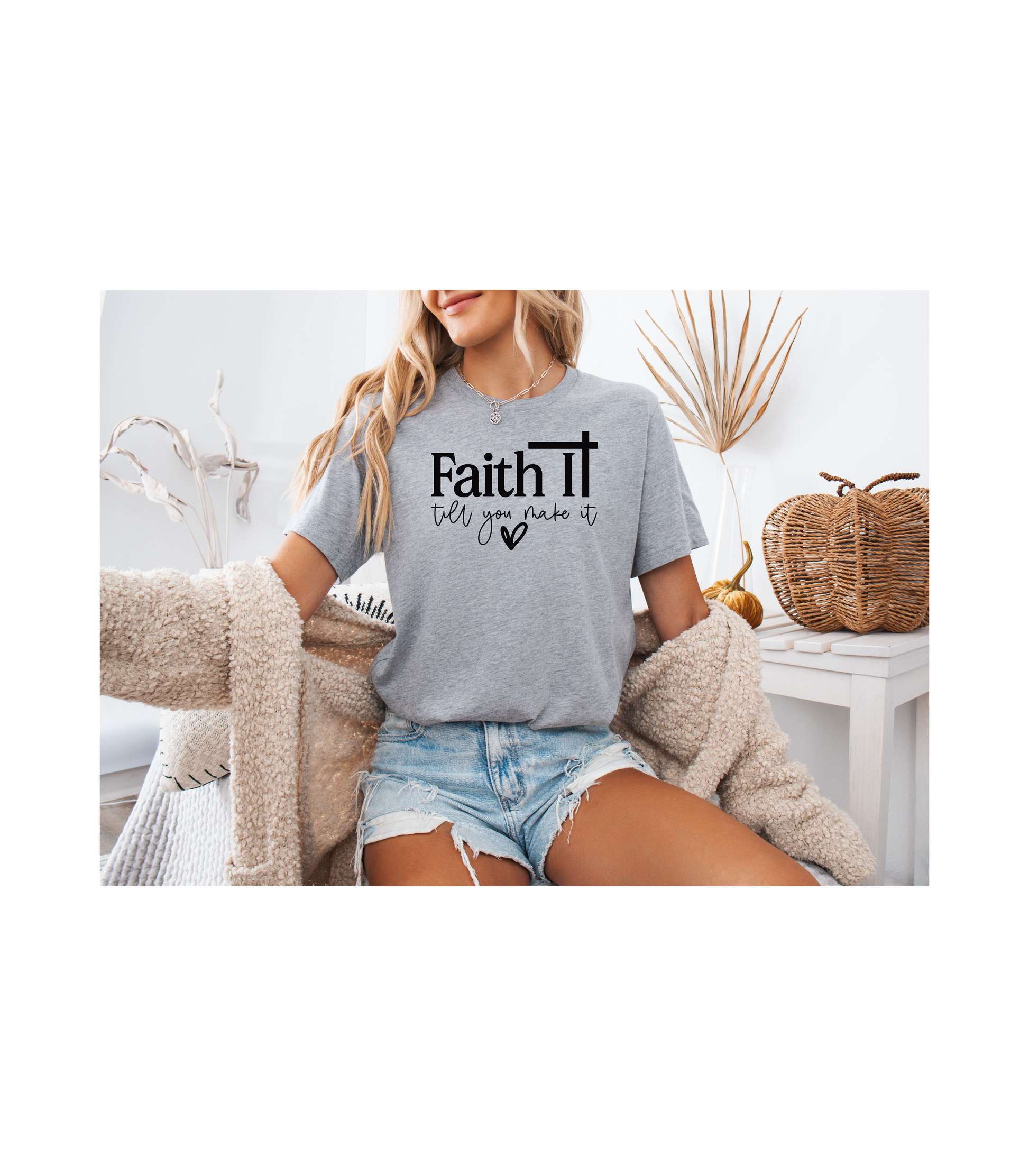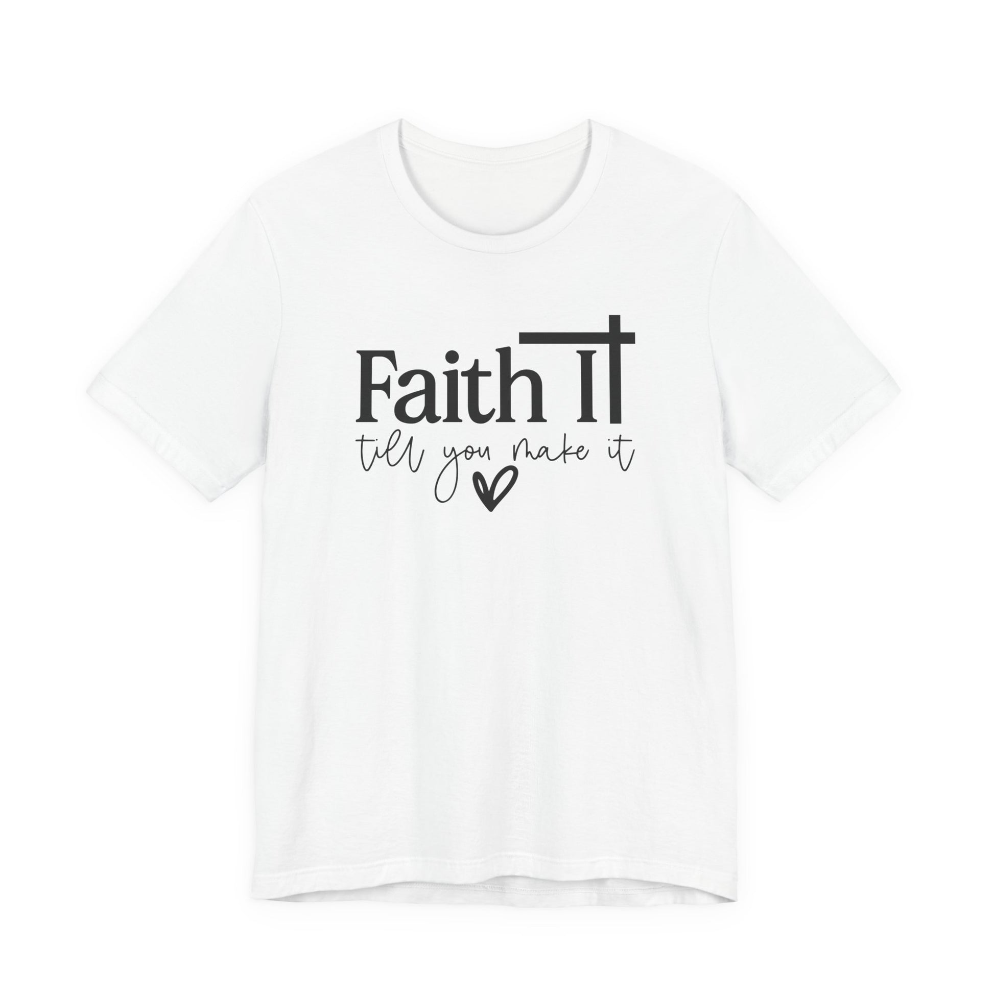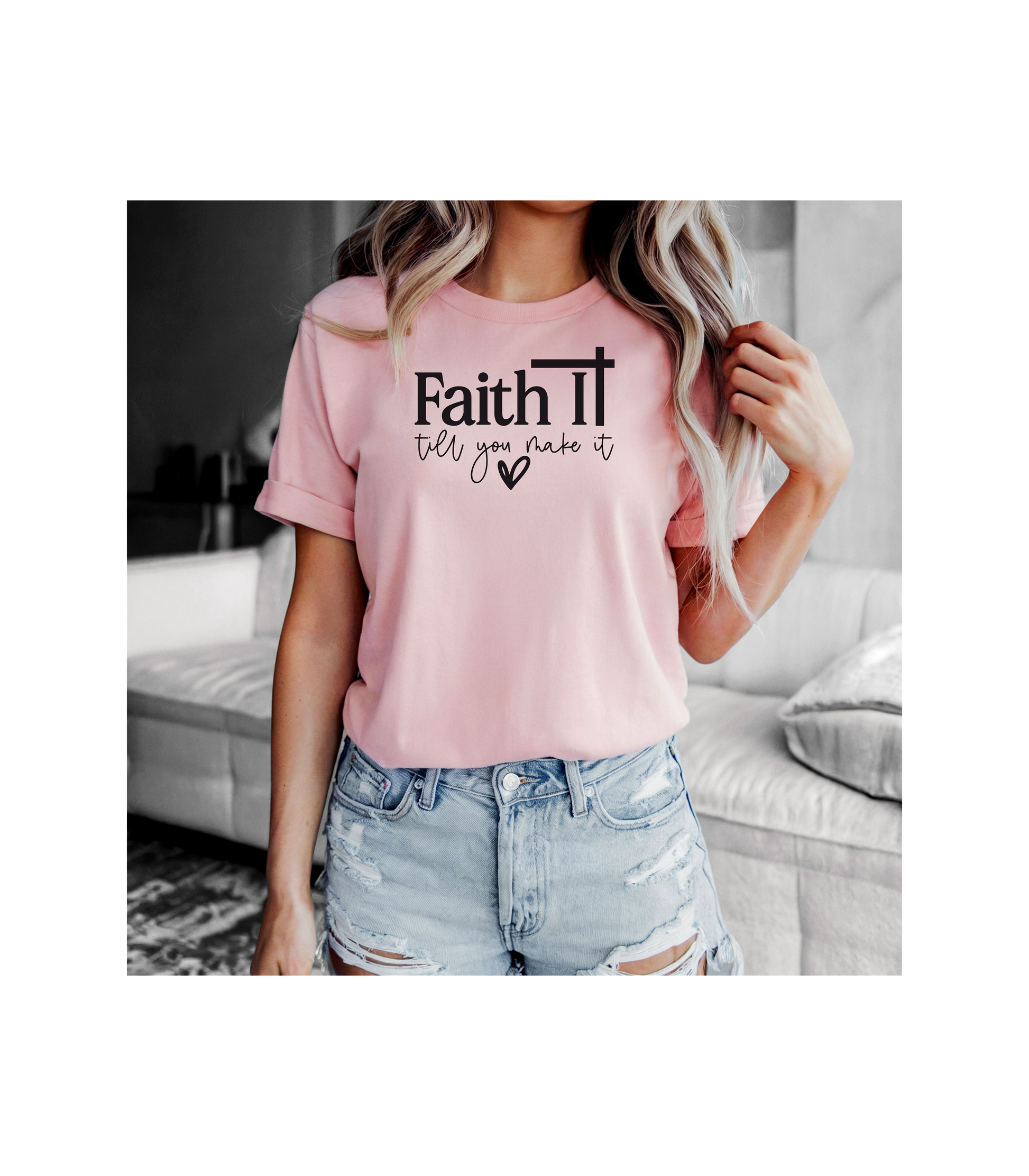 Motivational and inspirational quote "Faith It Till You Make It" T-Shirt for everyday wear. Perfect for those seeking faith-based apparel and looking for a spiritual boost. Suitable for Christians and anyone in need of motivation. Ideal for daily wear, church gatherings, and spiritual events.