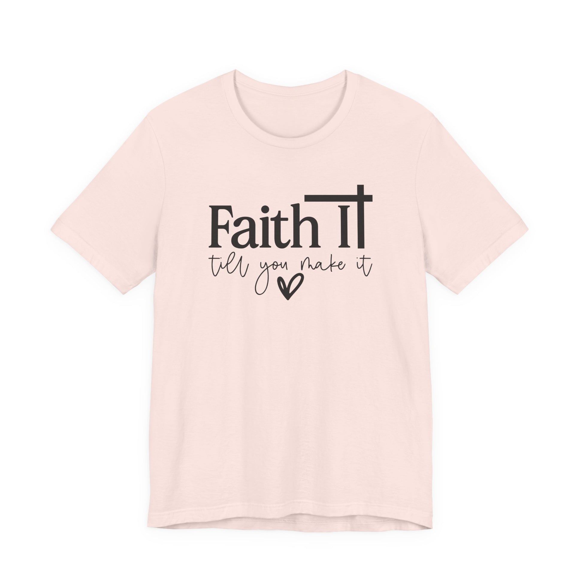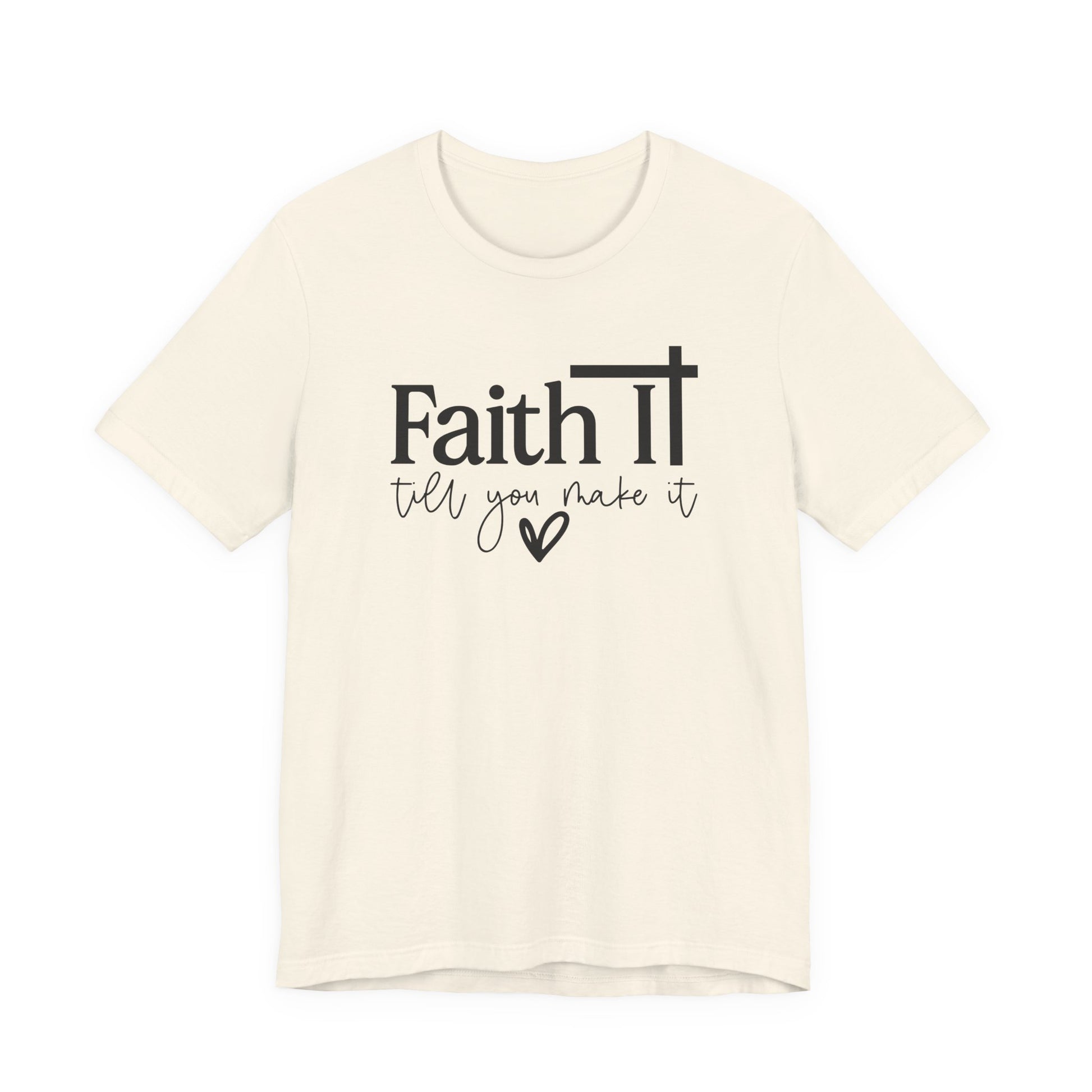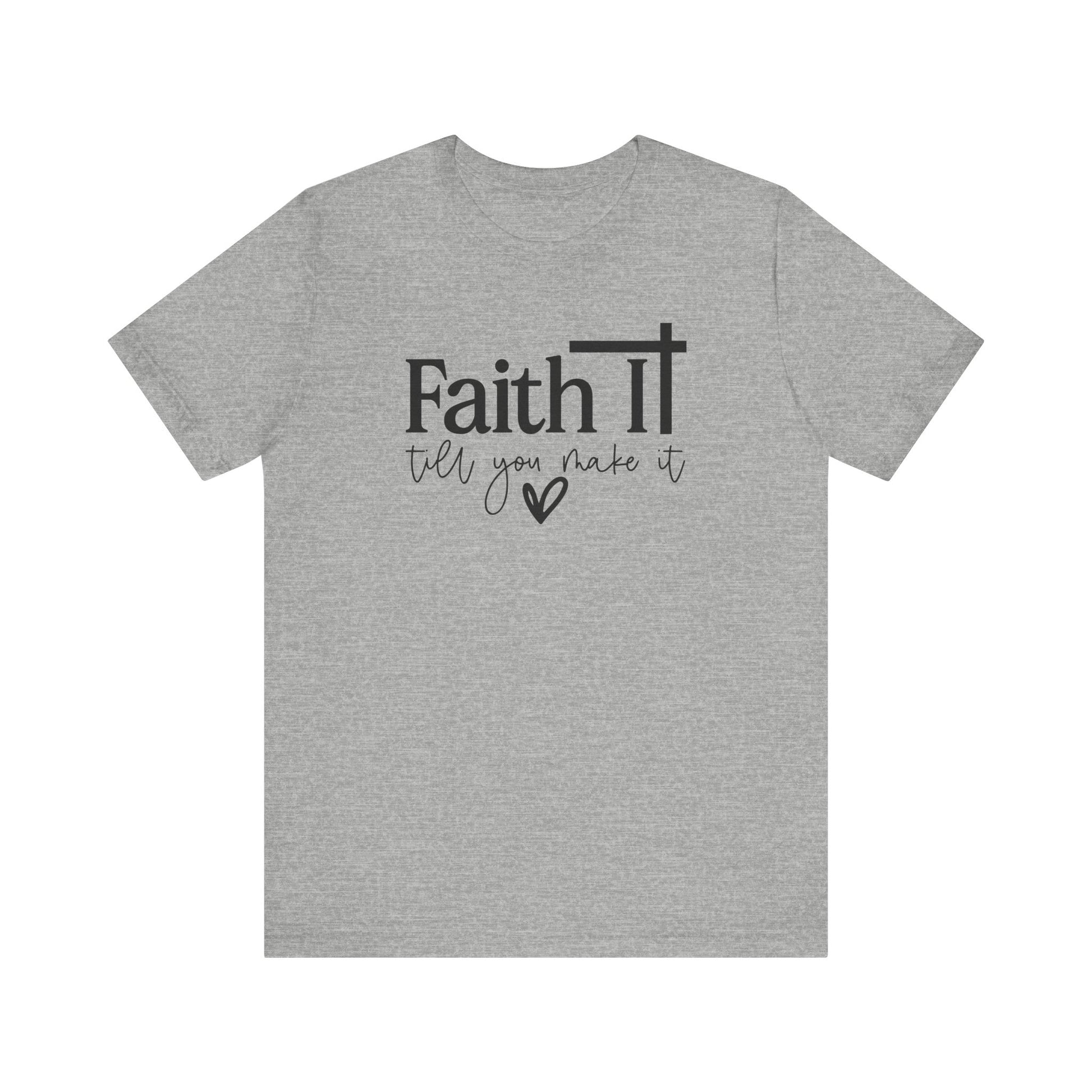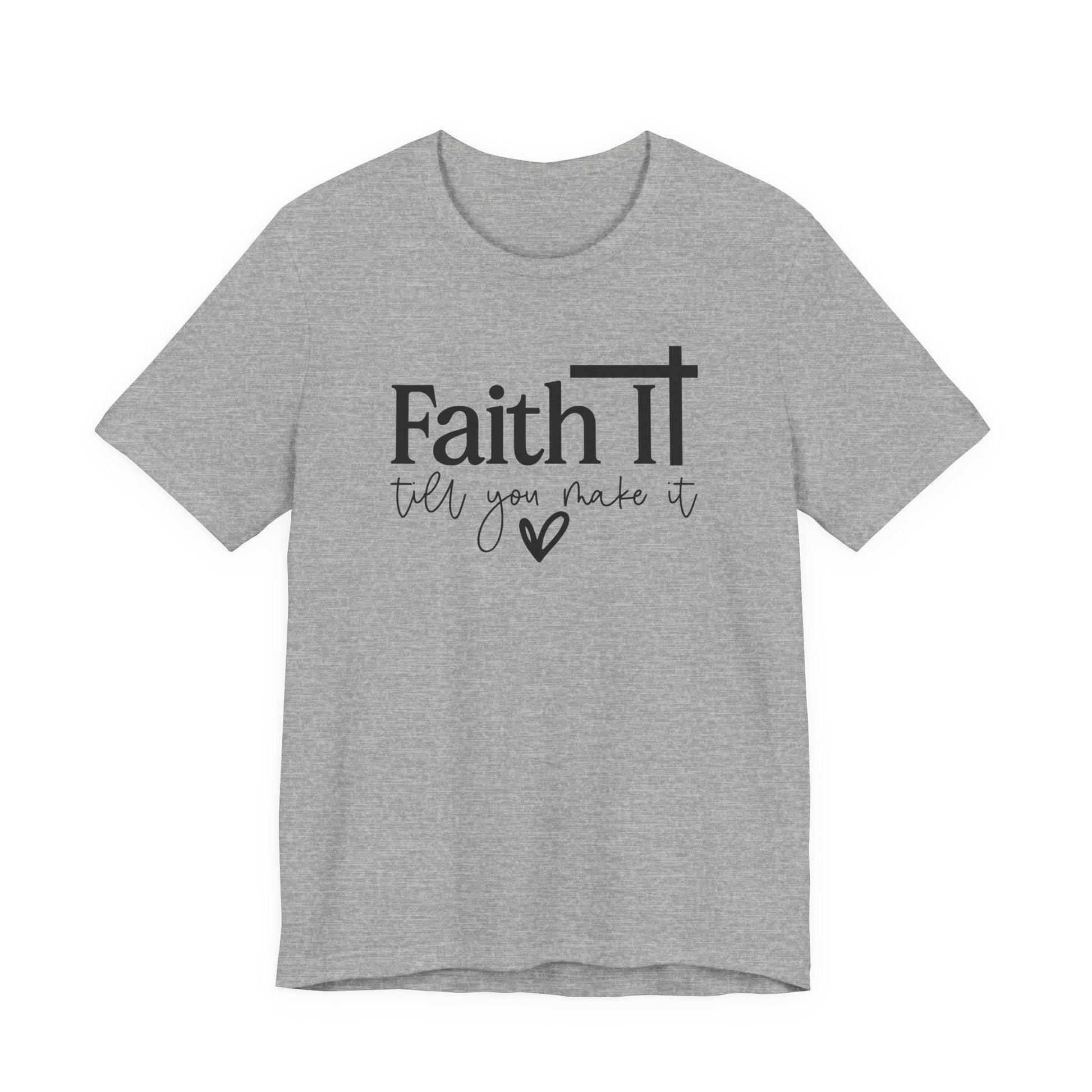 Motivational and inspirational quote "Faith It Till You Make It" T-Shirt for everyday wear. Perfect for those seeking faith-based apparel and looking for a spiritual boost. Suitable for Christians and anyone in need of motivation. Ideal for daily wear, church gatherings, and spiritual events.